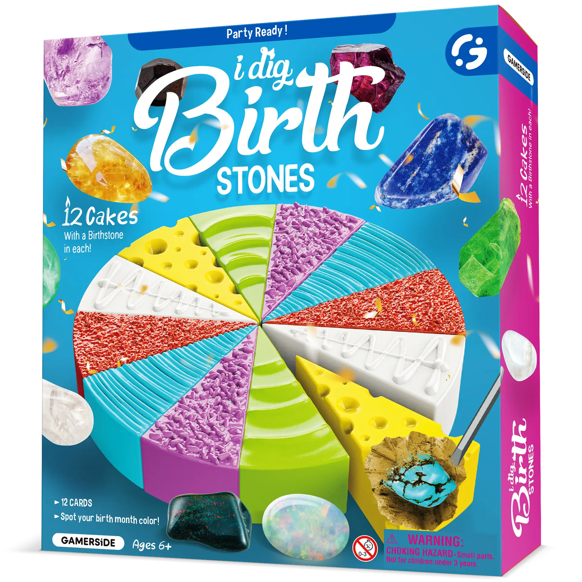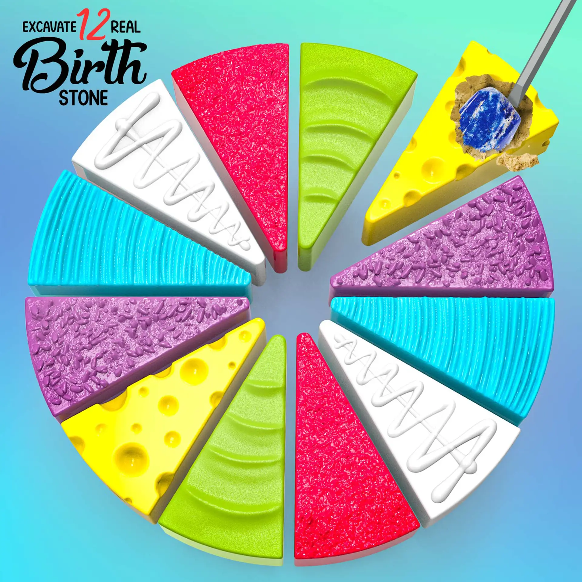 - DIG 12 GENUINE BIRTHSTONES – Excavate 12 unique birthstones (one for each month: Amethyst, Moonstone, Turquoise, Garnet, etc.) from a colorful cake-shaped block—perfect for a fun geology adventure!