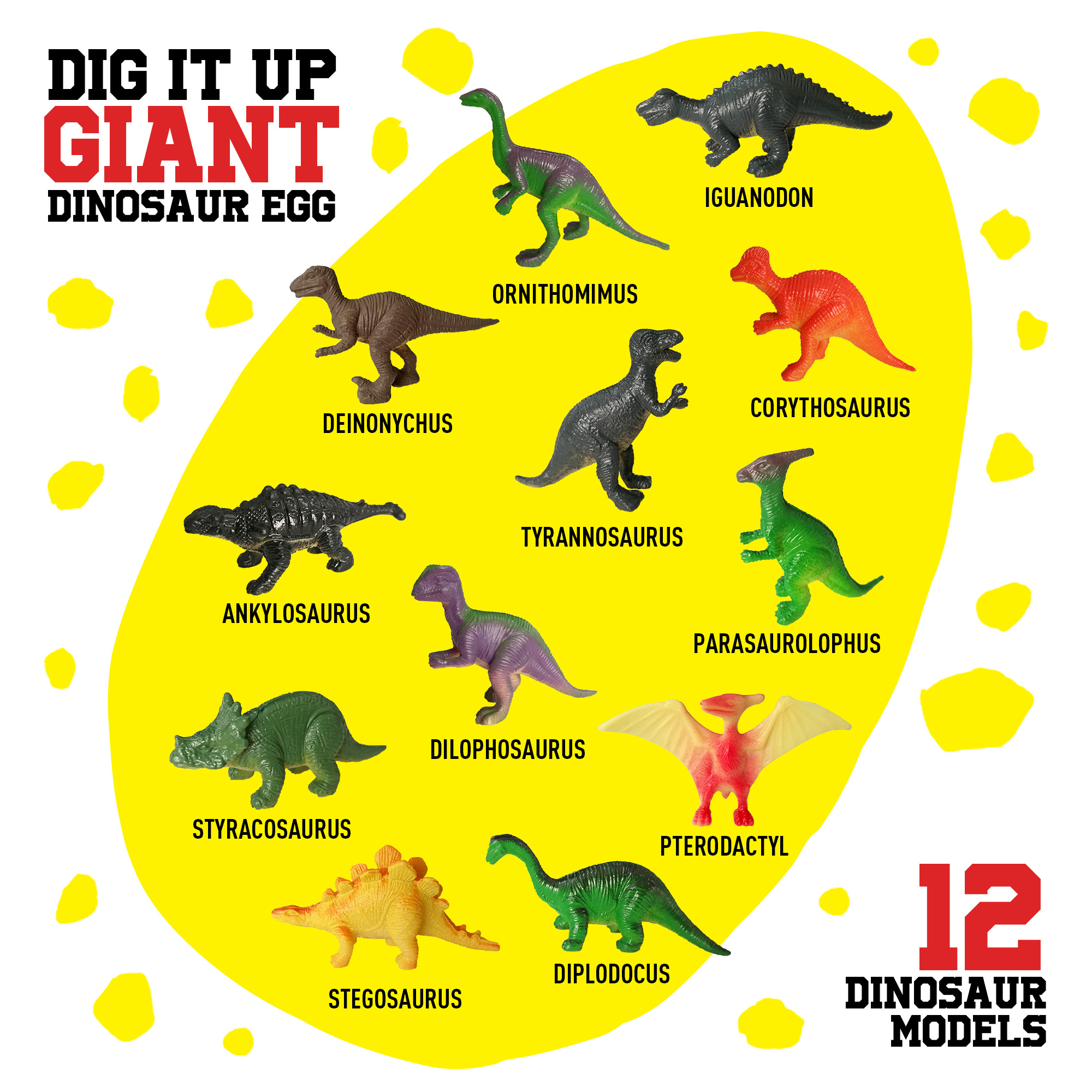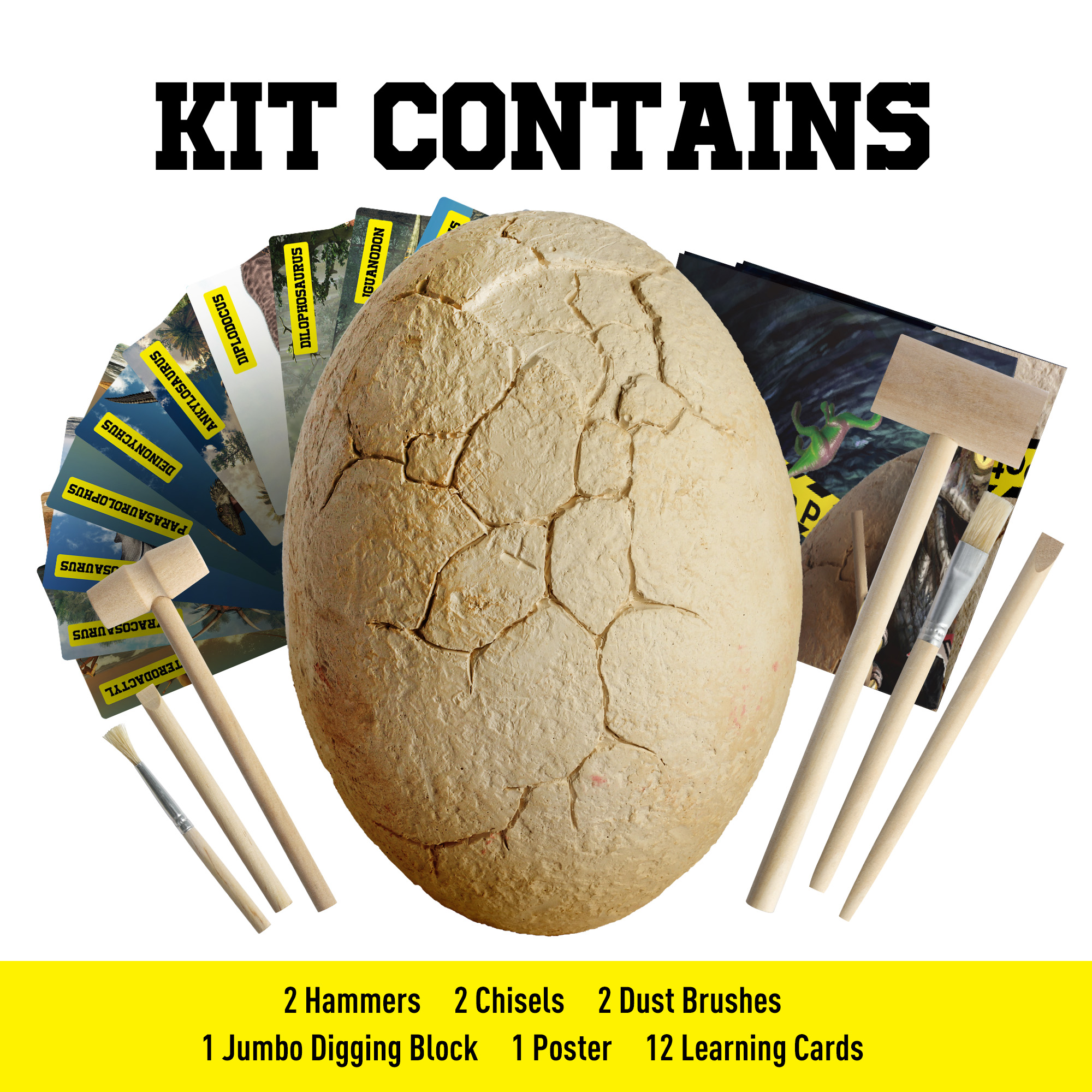 - Giant Dino Egg: Our dino egg dig kit has a large egg with 12 dino toys, 2 chisels, hammers, and brushes. Dig to find dinosaurs like T – rex. 12 color learning cards and a reference sheet aid identification, great for kids’ learning.