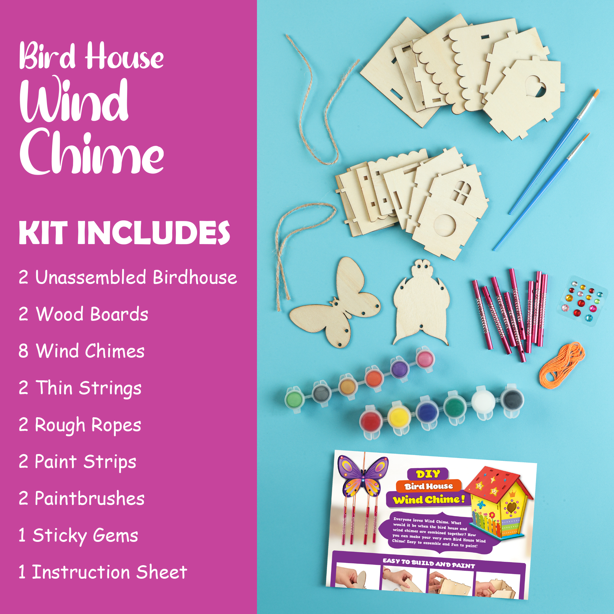 - 🕊️【DIY Bird House Wind Chimes for Kids – 2 Pack】This Bird House wind chime kits include 3 sets of DIY chime materials: 8 wind chimes ,2 Unassembled Birdhouses, 2 wood Boards, 2 Thin Strings, 2Rough Ropes , 2 Paint Strips, 2 Paintbrushes, 1 Sticky Gems and 1 Instruction Sheet.