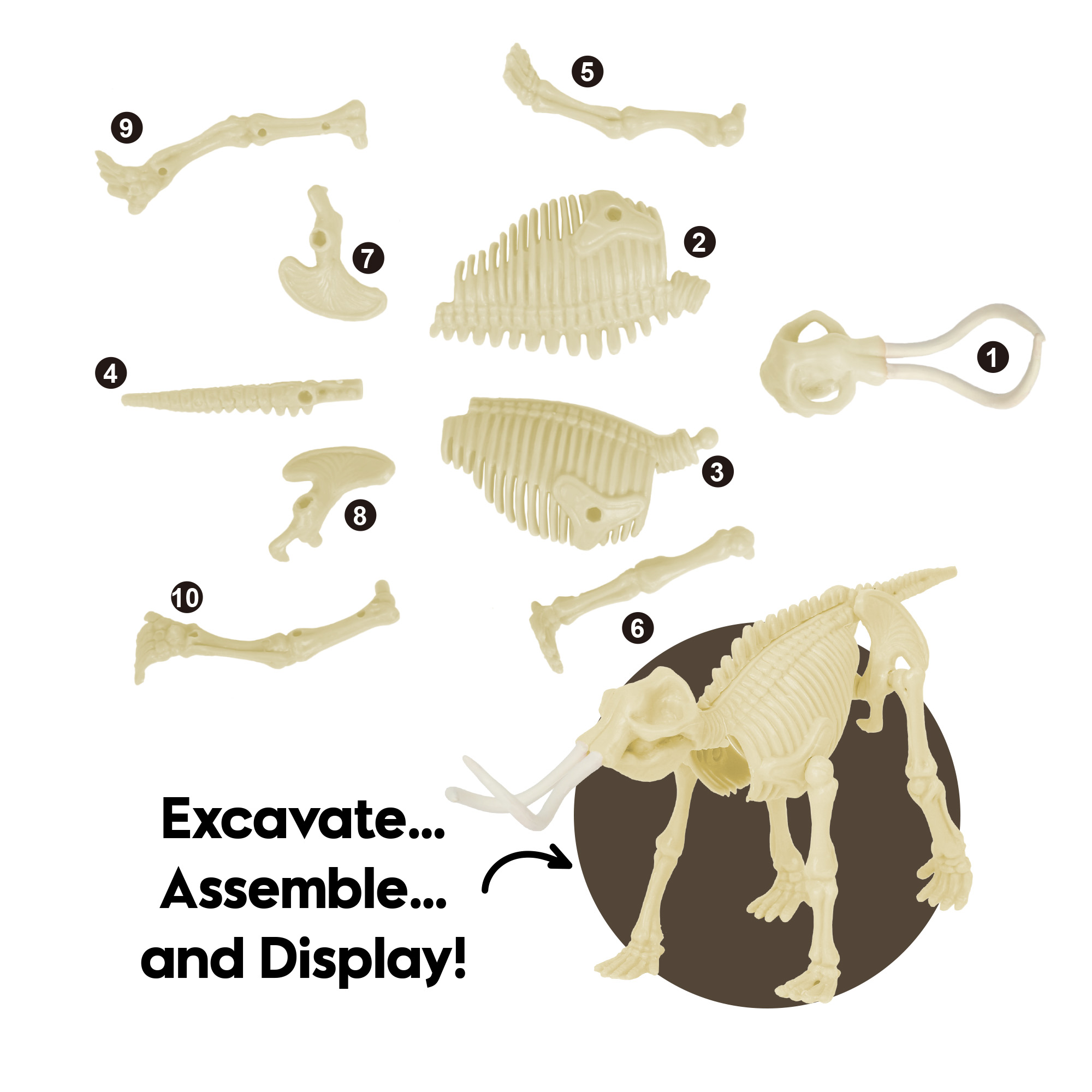 - Kit includes: 1 Earthern block, 1 digging tool, 1 digging brush , 1 digging hammer, and an instruction sheet.