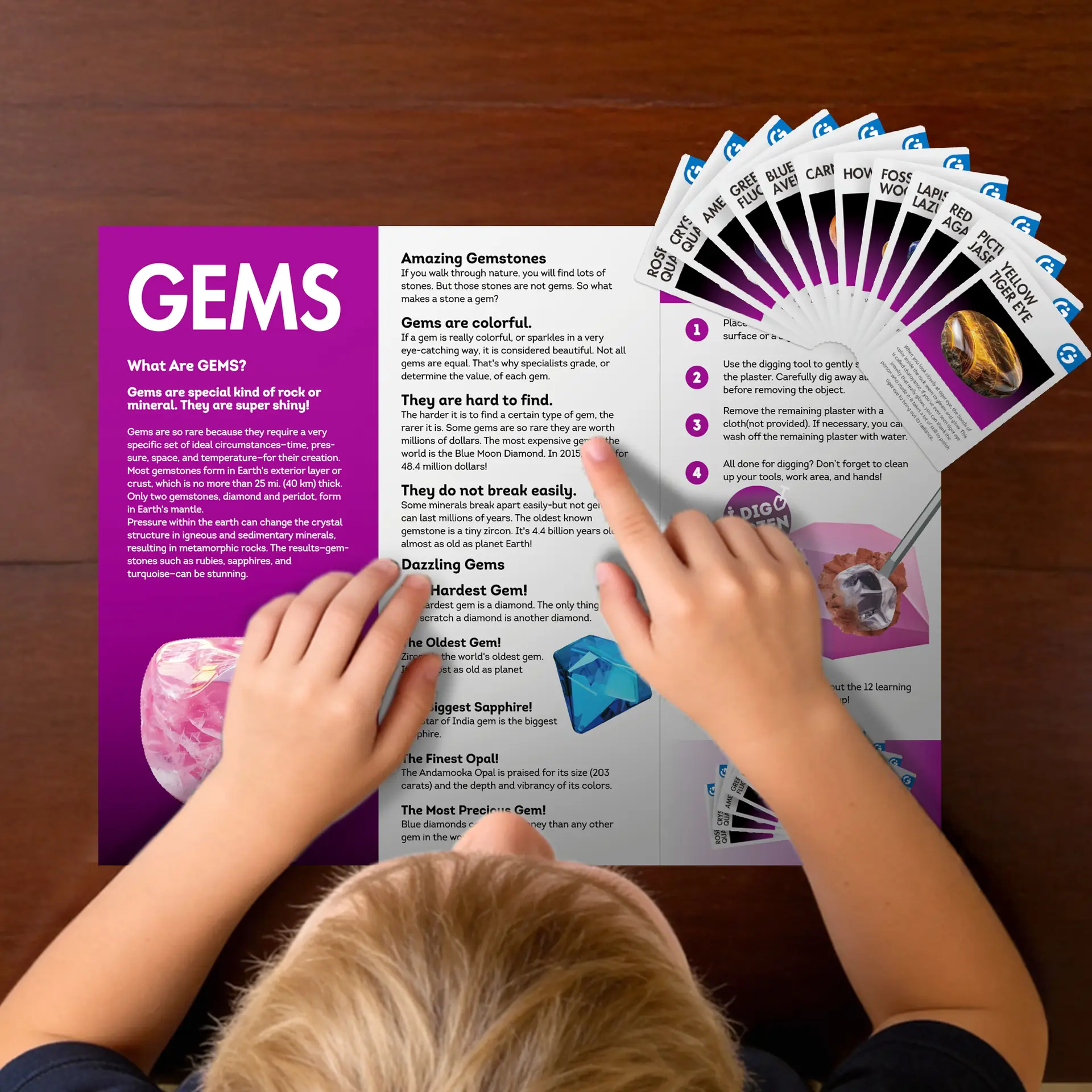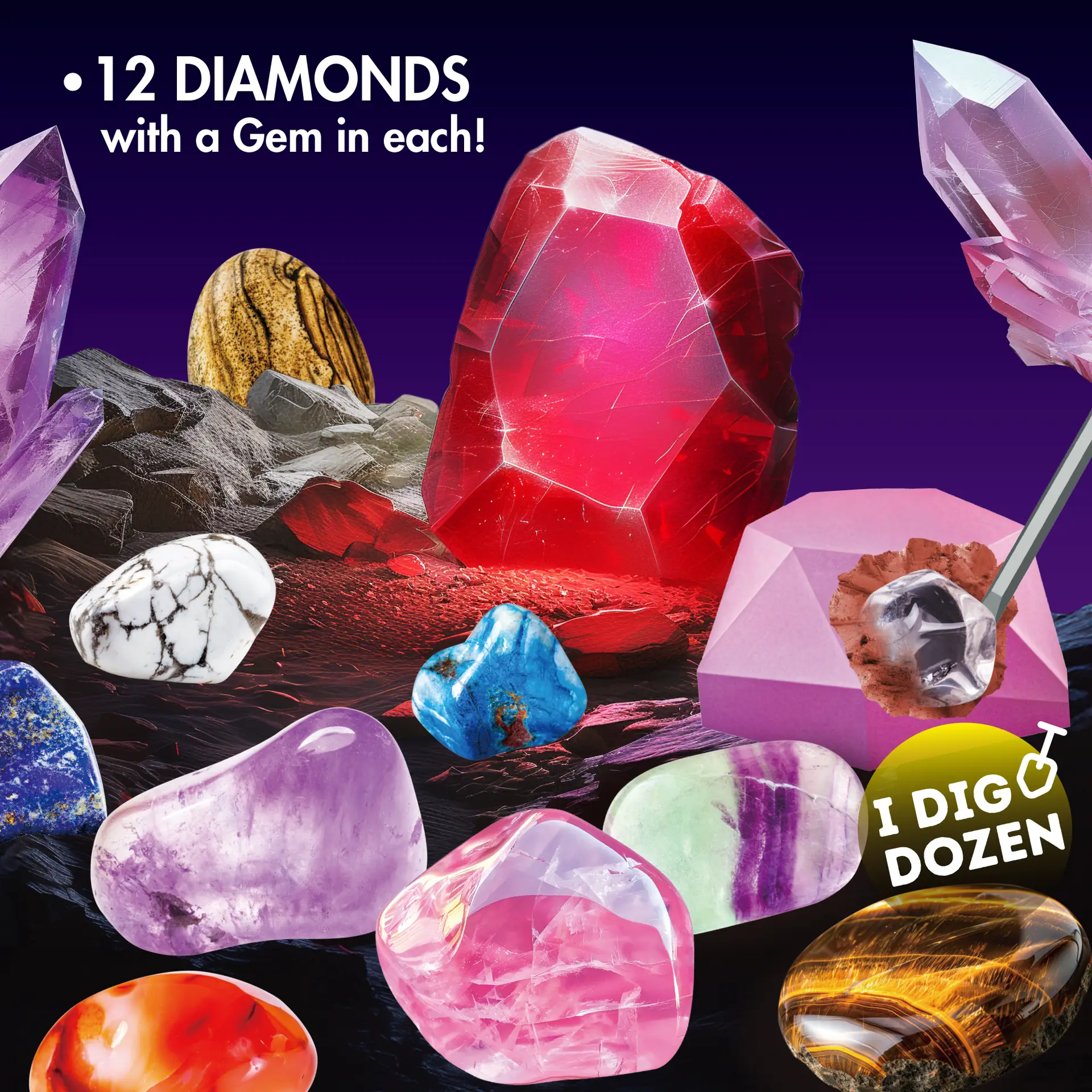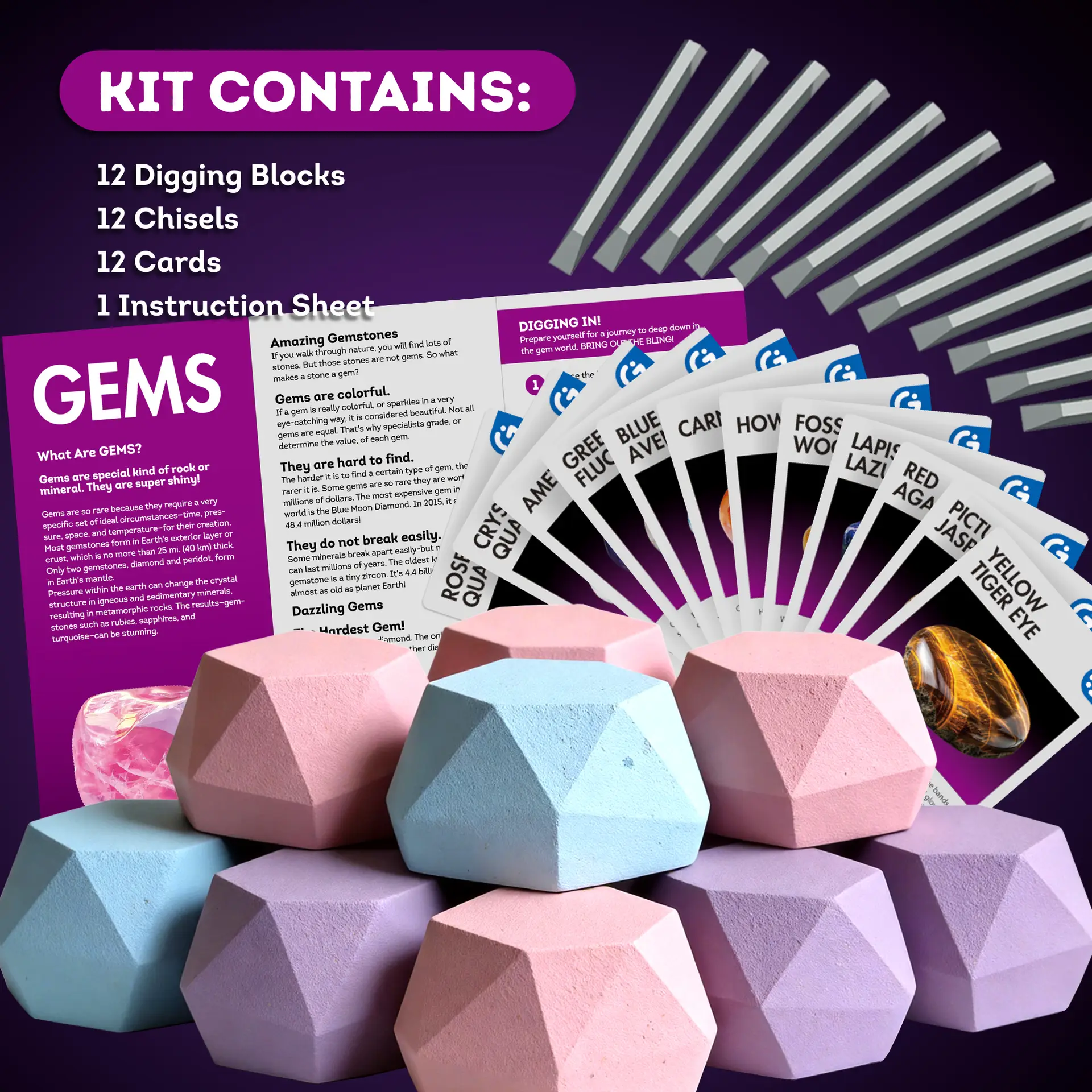 - Dig 12 Gemstones: Get ready to dig out 12 precious gems hidden on the gemstone blocks like a real geologist! Including rose quartz, blue aventurine, green fluorite, red agate, yellow tiger’s eye and much more. Learn more about the gems for children included in the coloured educational toy for children.