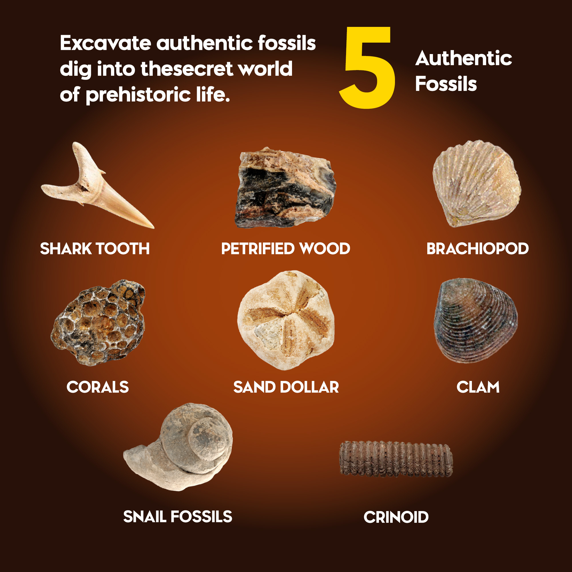 - Excavate 5 Real Authentic Fossils:This premium fossil dig kit lets kids uncover 5 genuine prehistoric fossils, with surprise finds including shark tooth, petrified wood, sand dollar, coral, snail fossils, brachiopod and more. It turns home play into a real paleontology adventure, the perfect excavation kit for young explorers.