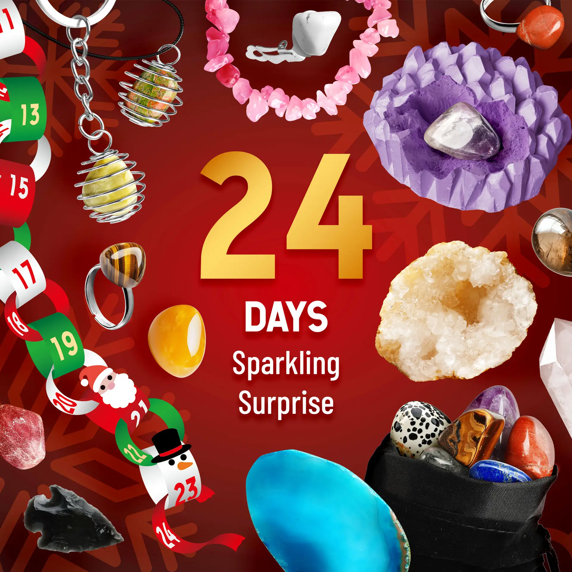 - 24 Days of Sparkling Surprises: Unwrap daily joy with this 2025 gemstone advent calendar! 24 hidden doors reveal 30+ treasures: 9 gems, 1 geode fragment, 2 full geodes, a gemstone bottle, and a collecting pouch. Turn Christmas countdown into a treasure hunt—perfect for curious kids who love an advent calendar 2025.