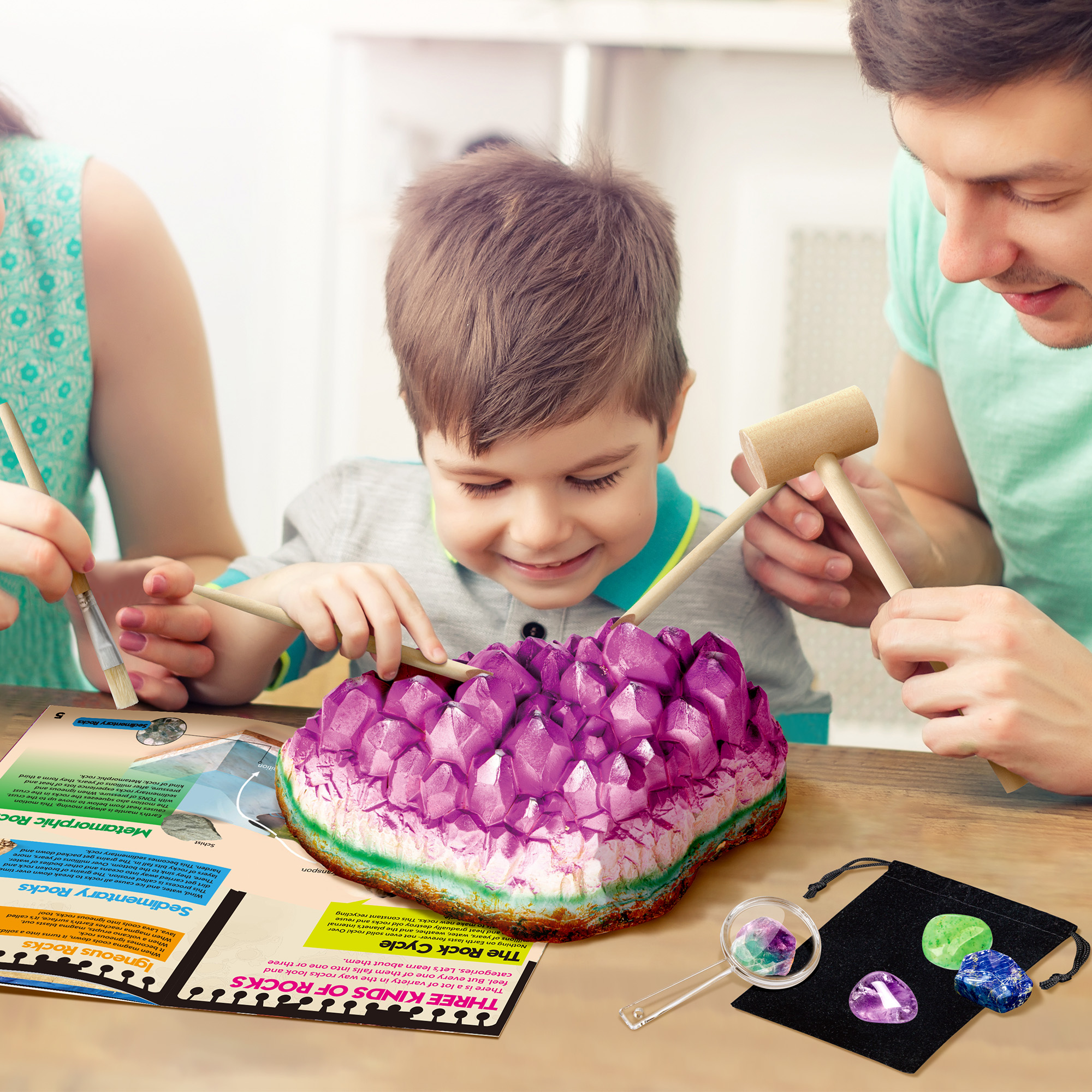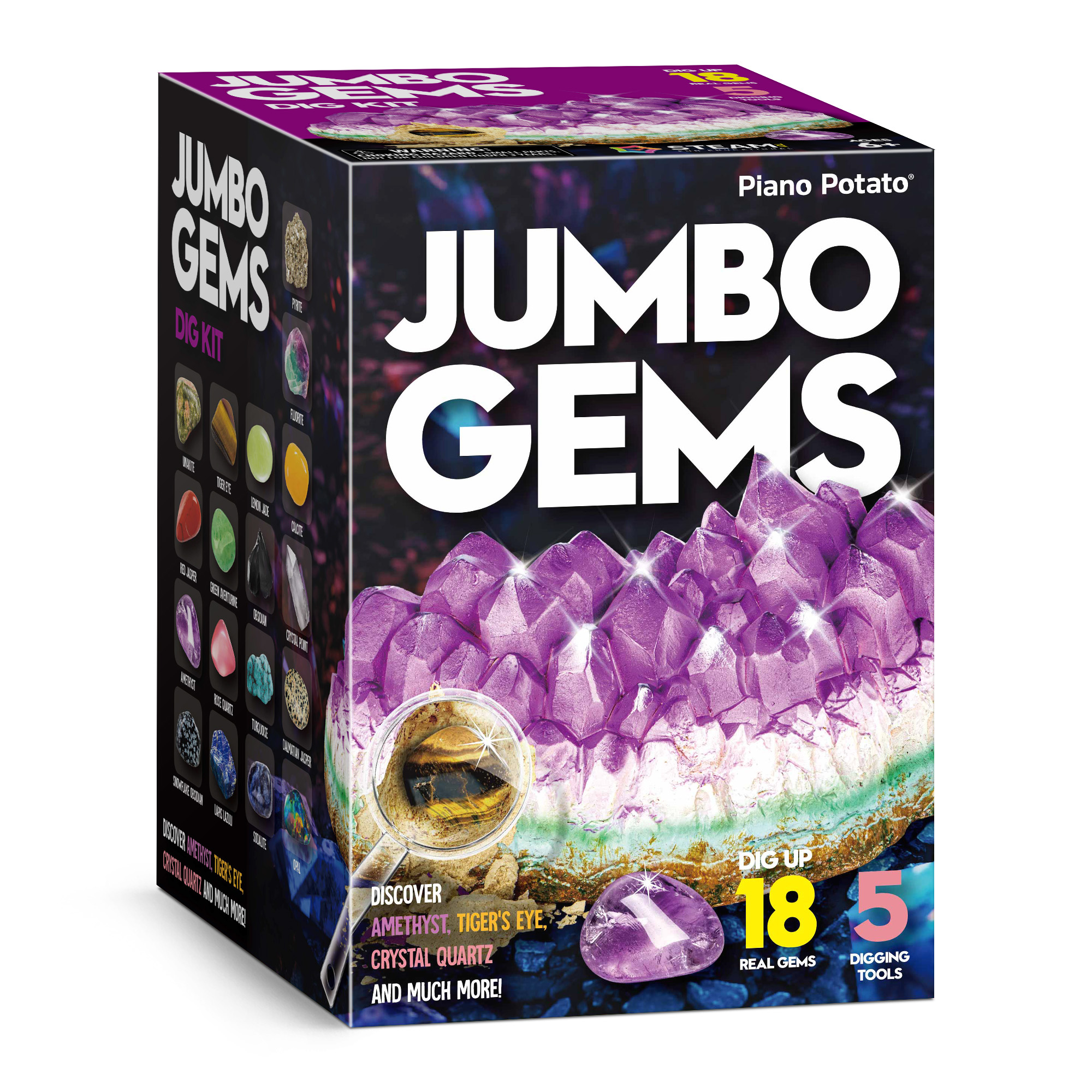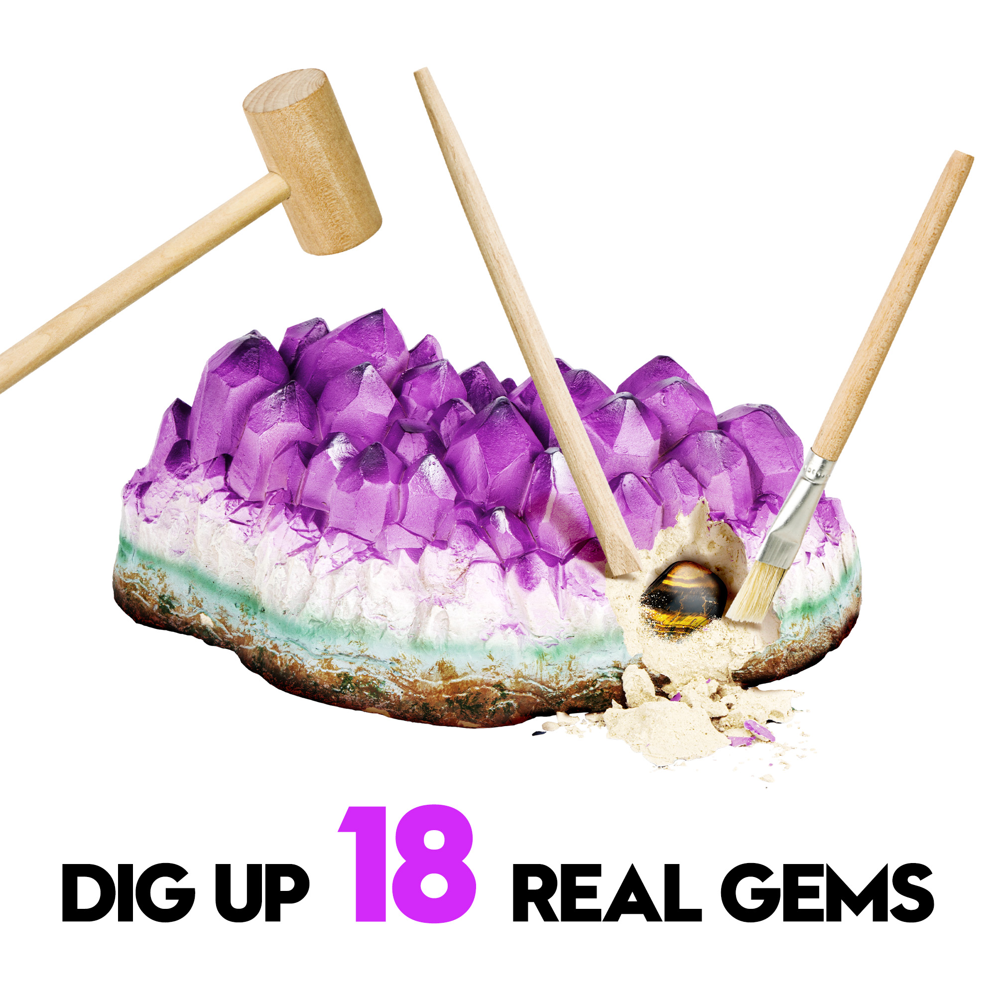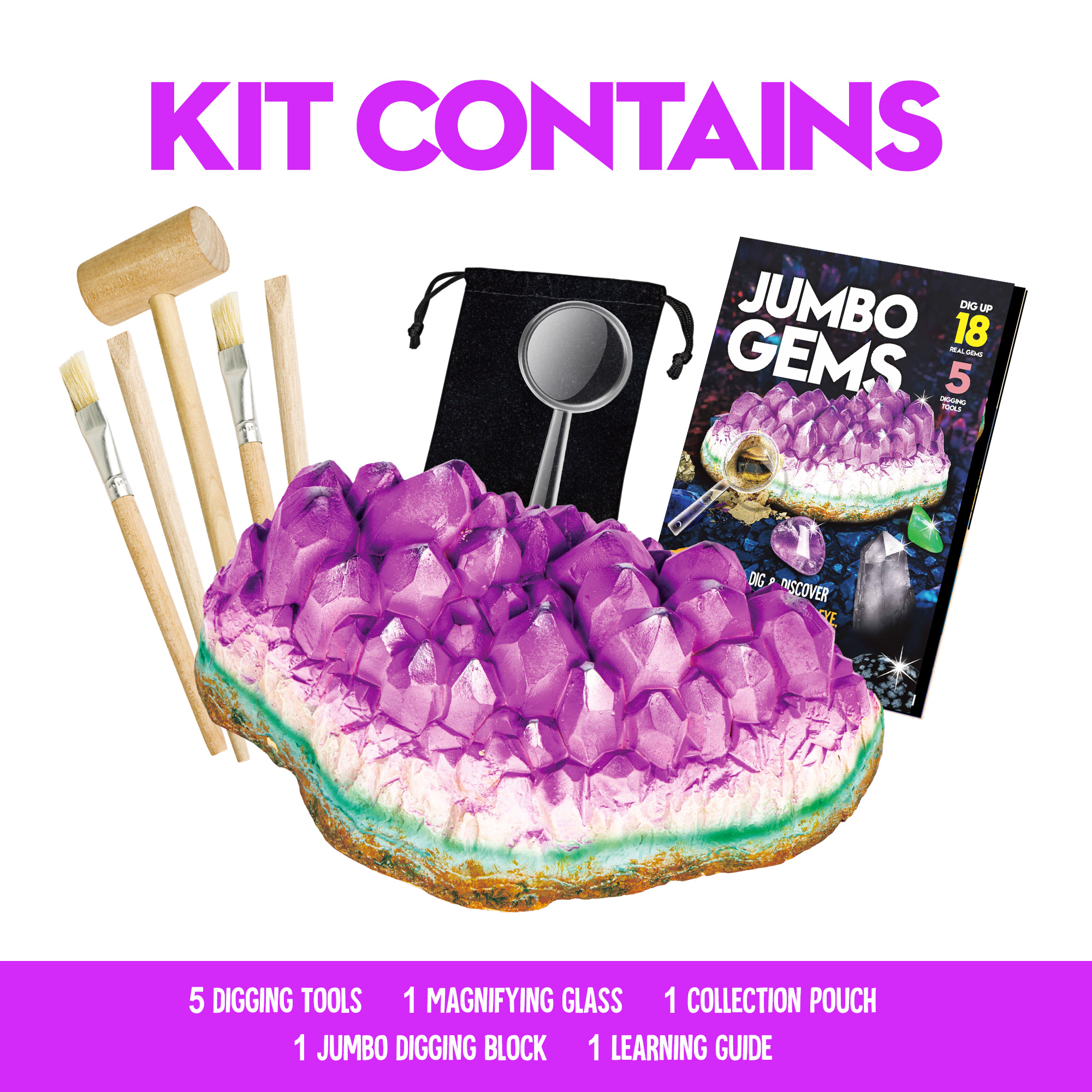 - [JUMBO GEMS DIG KIT] Discover the Excitement of Gemstones! Unearth a massive Amethyst block to reveal 18 radiant gem treasures. Delve into a vibrant learning experience with a vivid, full-color guide that unveils the secrets of gem formation and extraction, aiding young explorers in identifying their newfound specimens. This kit is an educational science kits for kids. Spark curiosity and empower kids with hands-on gem education!