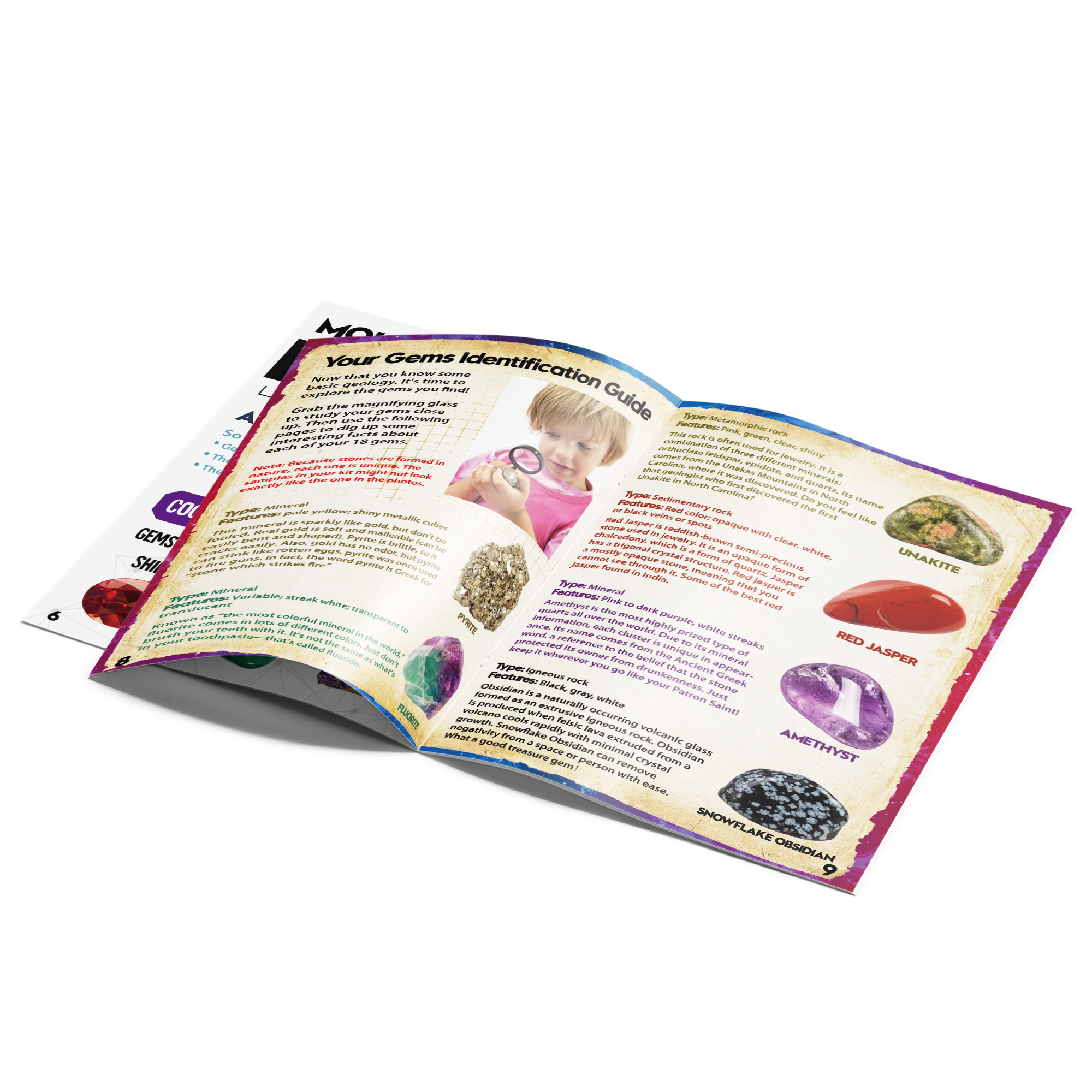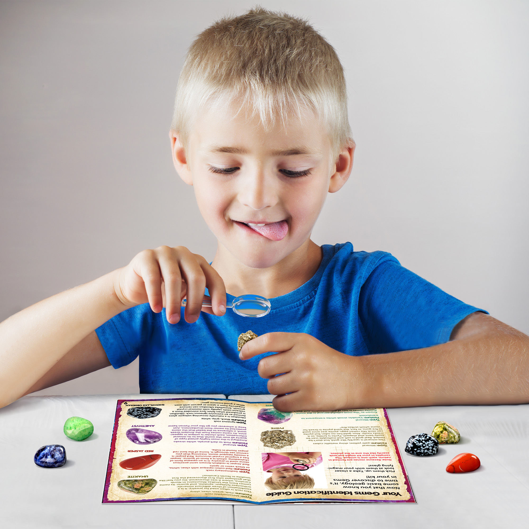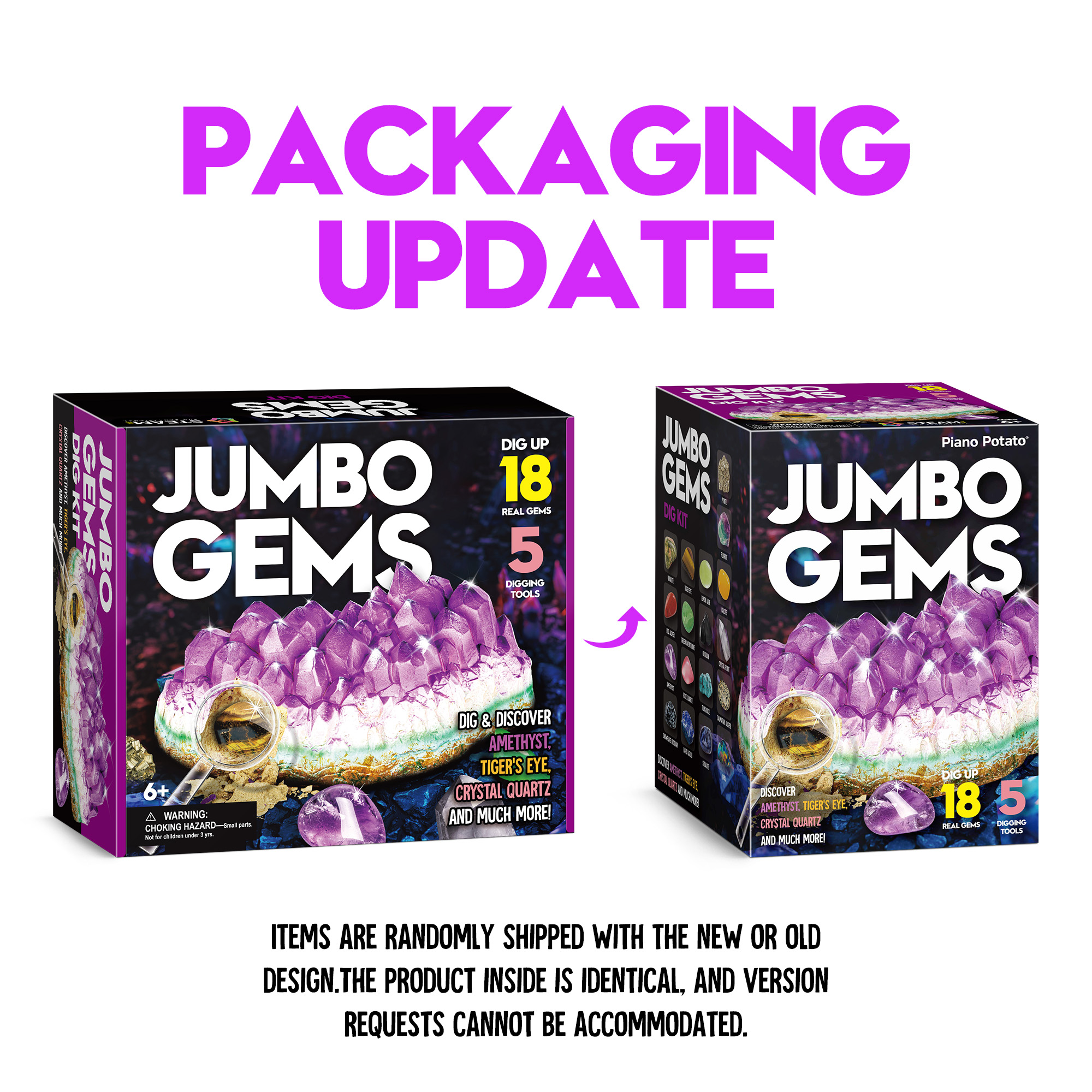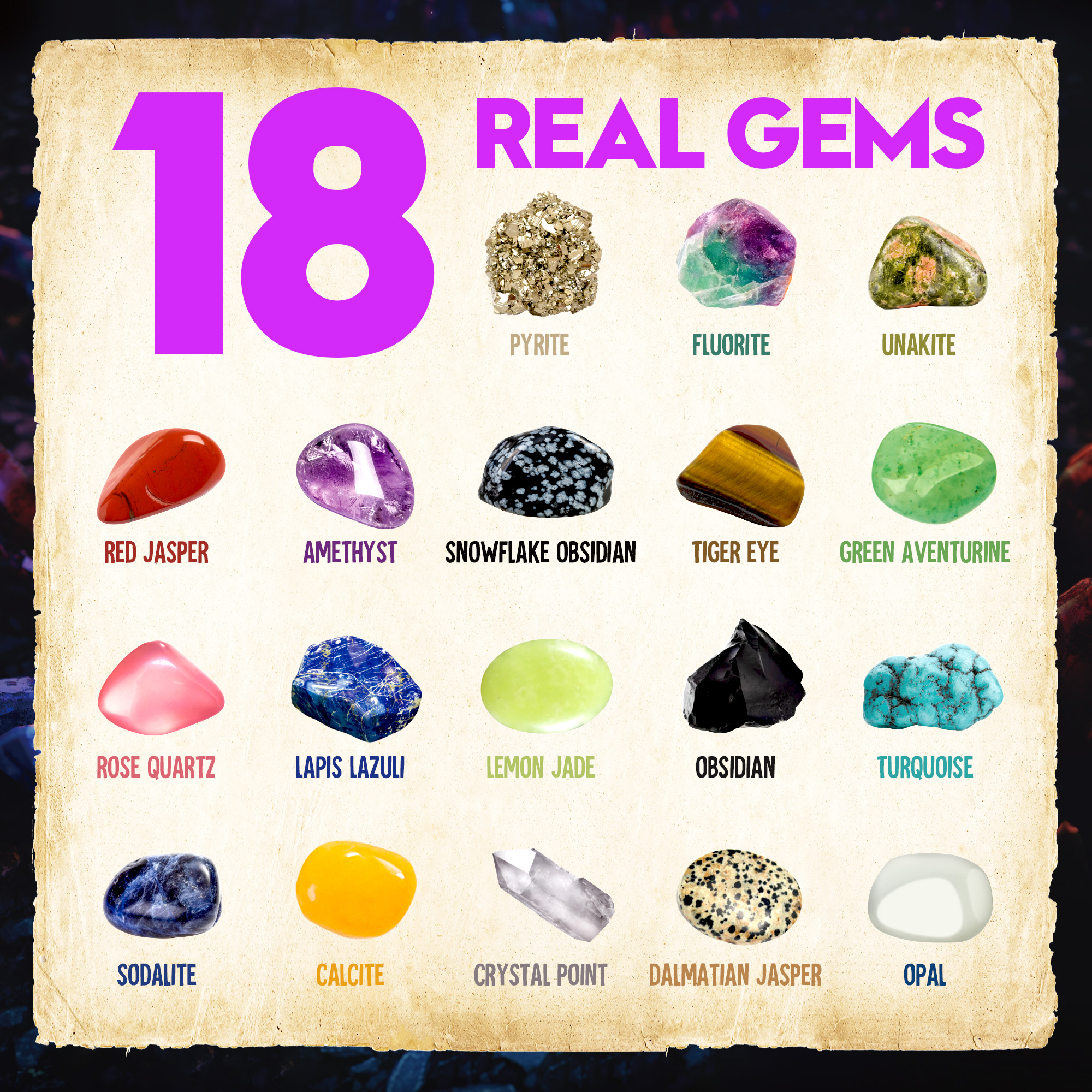 - [JUMBO GEMS DIG KIT] Discover the Excitement of Gemstones! Unearth a massive Amethyst block to reveal 18 radiant gem treasures. Delve into a vibrant learning experience with a vivid, full-color guide that unveils the secrets of gem formation and extraction, aiding young explorers in identifying their newfound specimens. This kit is an educational science kits for kids. Spark curiosity and empower kids with hands-on gem education!
