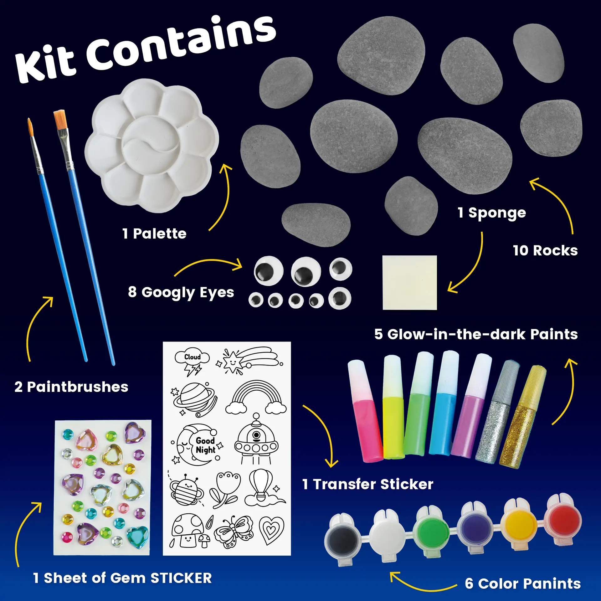 - All-In-One Complete Craft Supplies:No extra tools needed! This rock painting kit includes everything for fun: 1 palette, 8 googly eyes, 1 sponge, 2 paintbrushes, transfer stickers, gem stickers, and all paints. The kid-friendly supplies make it easy for little hands to create unique glow rocks.