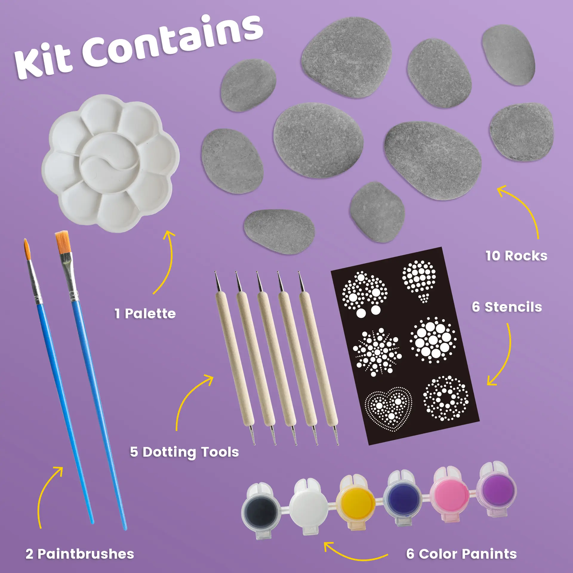 - Complete Kit, Nothing Else Needed – 10 rocks, 6 paints, 2 brushes, 5 dotting tools, 6 stencils, and a palette.