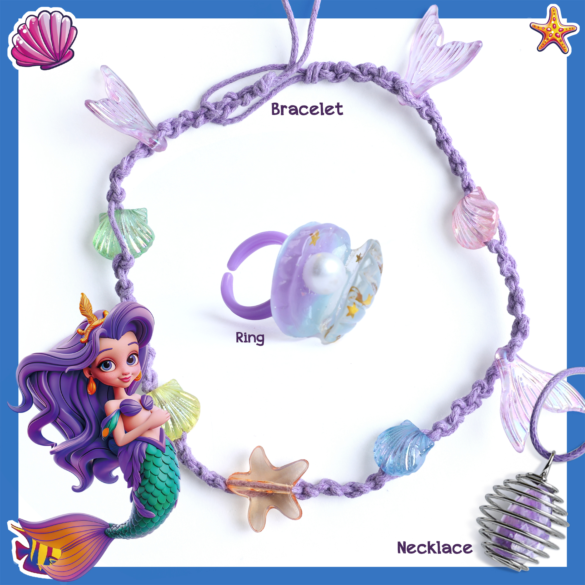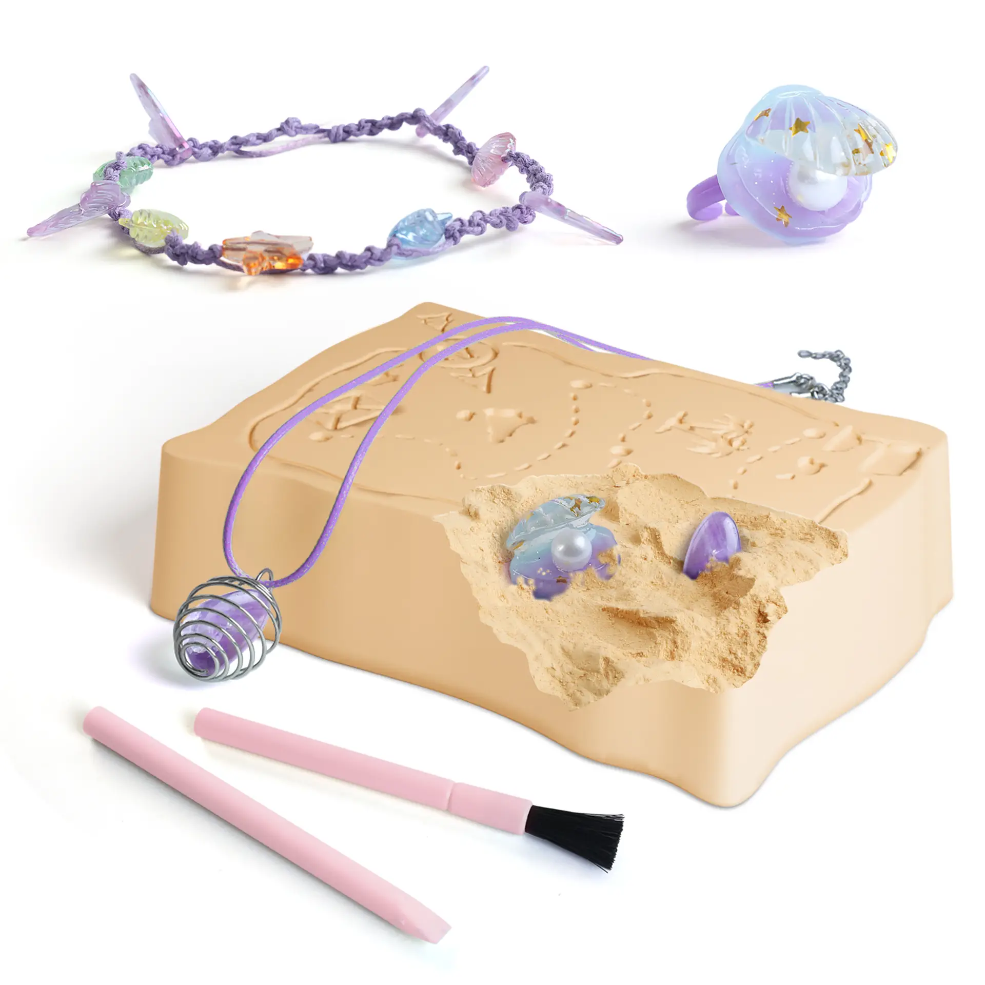 - Craft Your Ocean-Inspired Jewelry: Utilize the treasures you excavate, including amethyst, starfish bead, shell beads, and mermaid tail beads, to design and create your bracelet, necklace, and ring, infusing them with the magic of the sea.