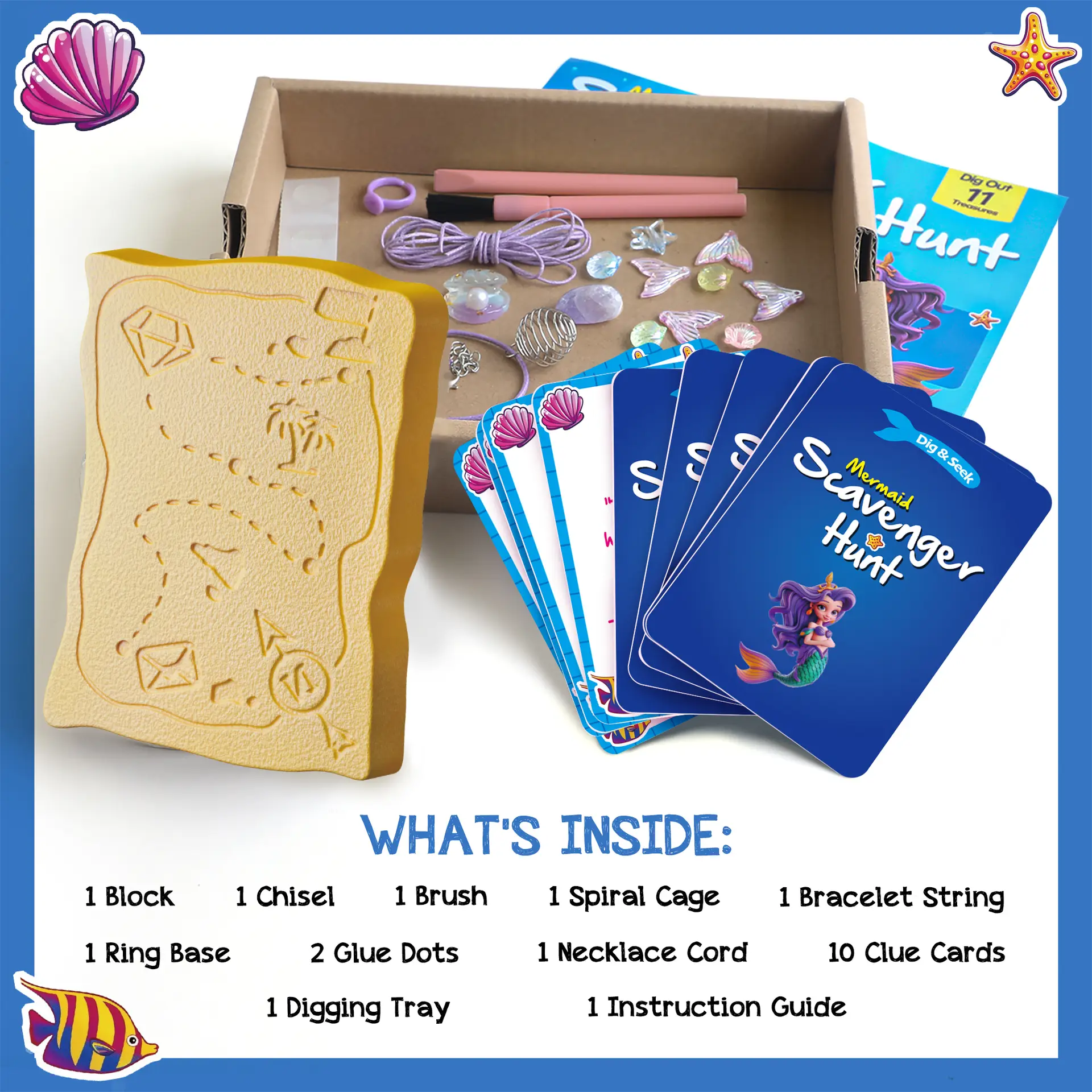 - Excavation Contents: Dive deep and uncover the following treasures: Amethyst: Discover the captivating beauty of amethyst gemstones. 5 Shell Beads: Find five exquisite shell-shaped beads. 4 Mermaid Tail Beads: Unearth four enchanting mermaid tail-shaped beads. Starfish Bead: Dig out a charming starfish-shaped bead.