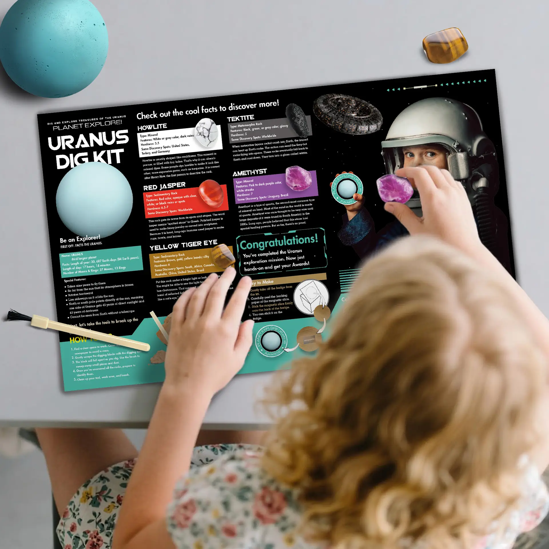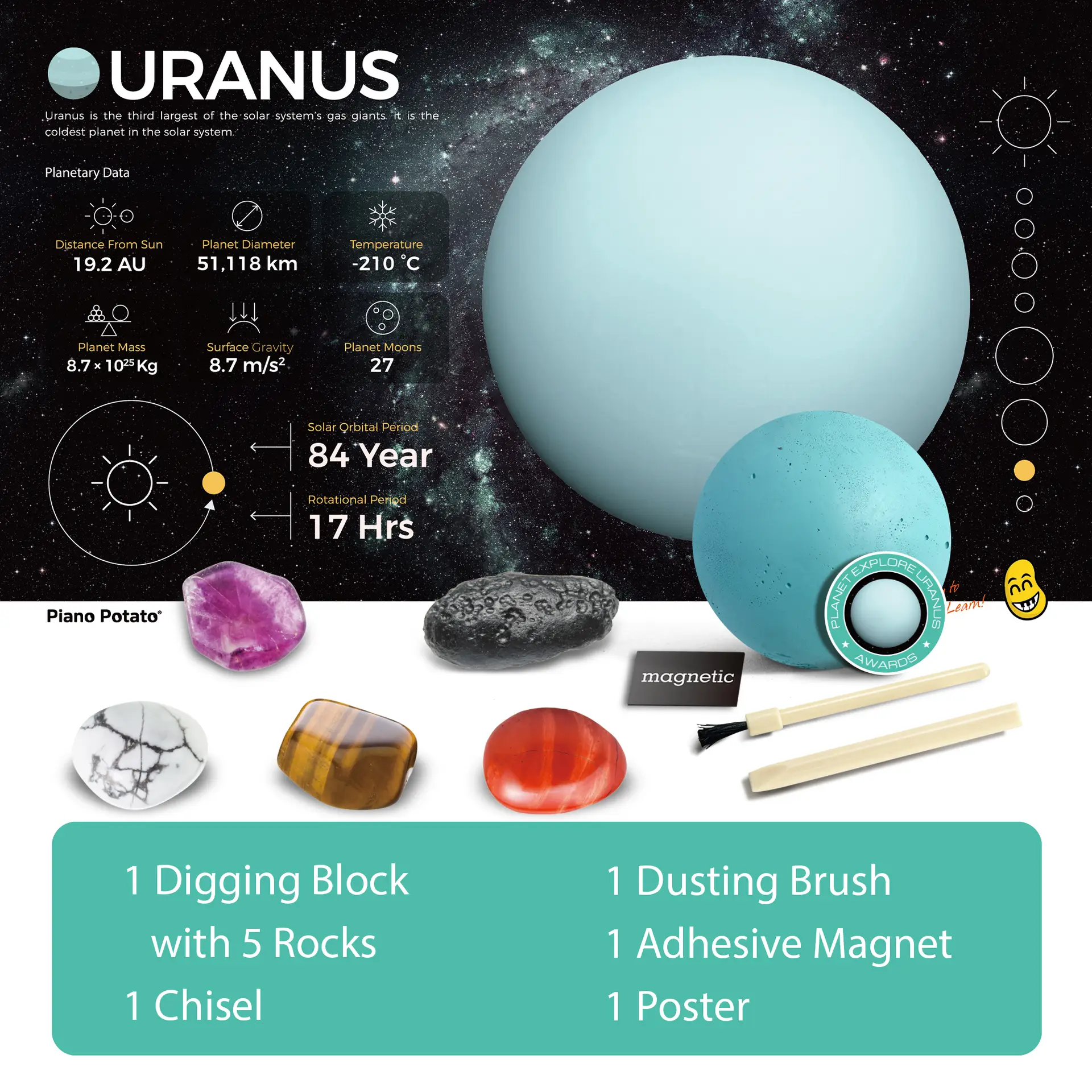 - Complete Rock Collection & Dig Game Set: Discover 1 unique Uranus planetary blocks each with minerals matching their “surface.” Use the magnetic display cards to showcase findings after digging!