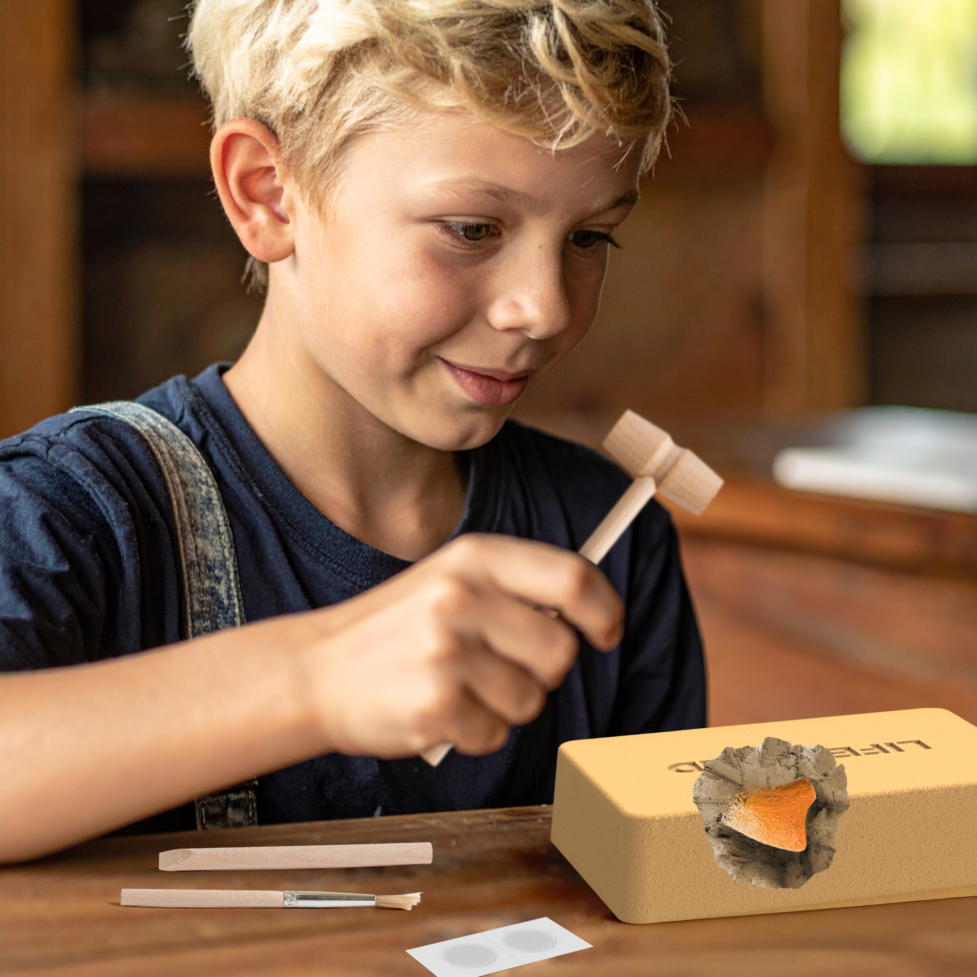 - All-In-One Complete Kit – No Extra Supplies Needed: Each kit comes fully equipped with everything required for an immersive digging adventure: a sturdy digging block, wooden hammer and chisel for safe chipping, a soft brush for delicate cleaning, a display frame with glue dots, and a detailed instruction sheet. Simply unbox and start exploring—no additional tools or materials required.