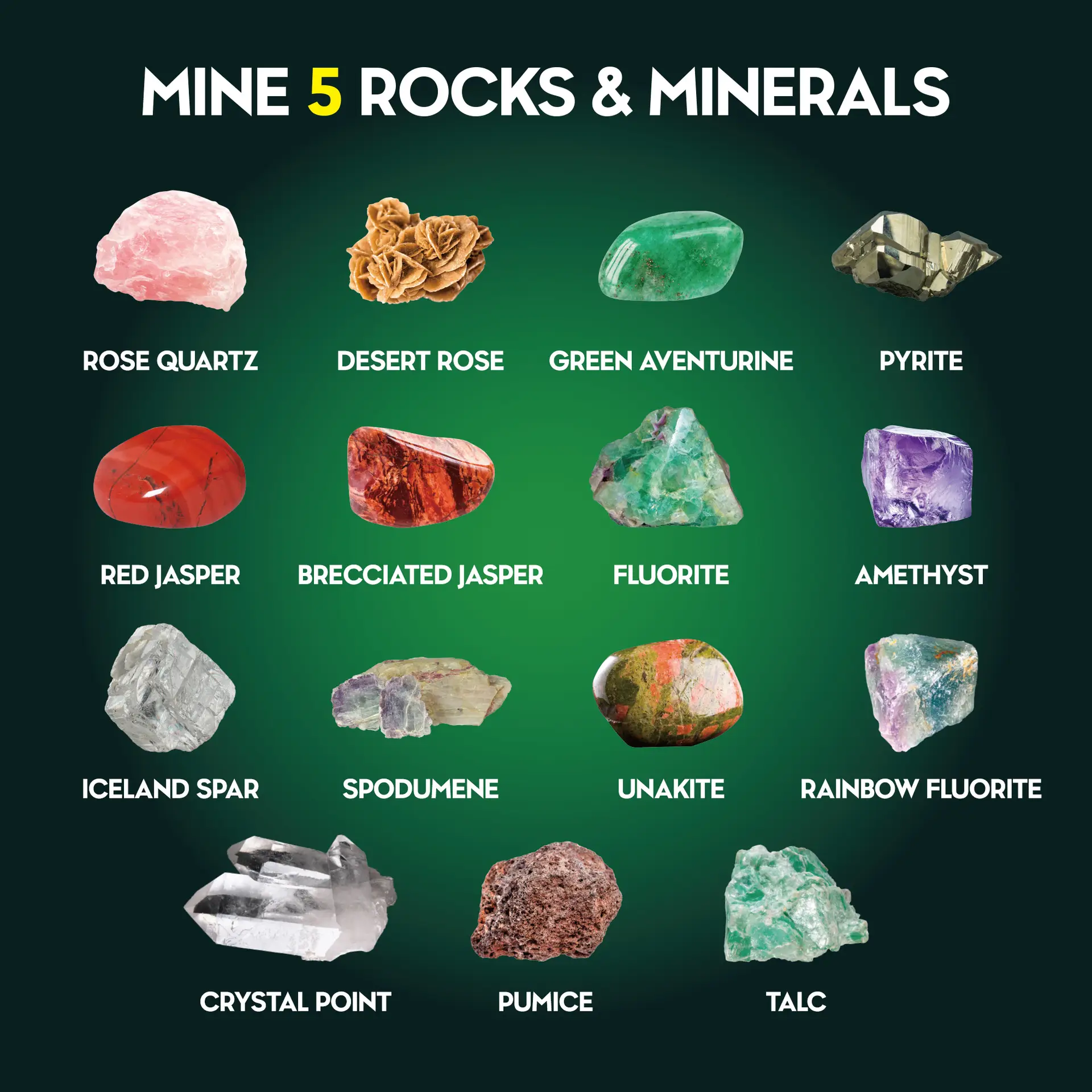 - Excavate 5 Real Rocks & Minerals:Dive into the world of geology with this rocks and minerals mining kit! Dig up 5 genuine mineral specimens, with surprise finds including rose quartz, amethyst, fluorite, pyrite, green aventurine and more. It lets kids explore real geology treasures and experience the thrill of being a true geologist.