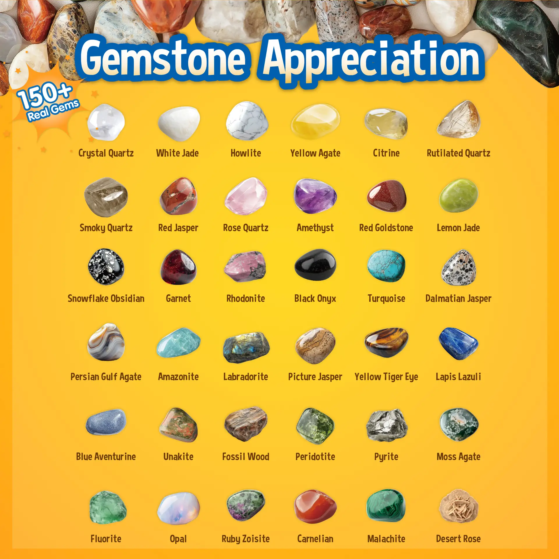 - [STEM Educational Treasure Chest for Kids] This rocks for kids includes 150+ real gems, 1 game bowl, 1 bag, 1 sand timer, 2 game boards, 12 cards, 1 instruction sheet, serving as an entertaining educational tool suitable for children ages 6+. It sparks interest in natural sciences through play, enhances knowledge of gemstones and minerals, and addresses parents’ dual needs for both educational effectiveness and entertainment value.