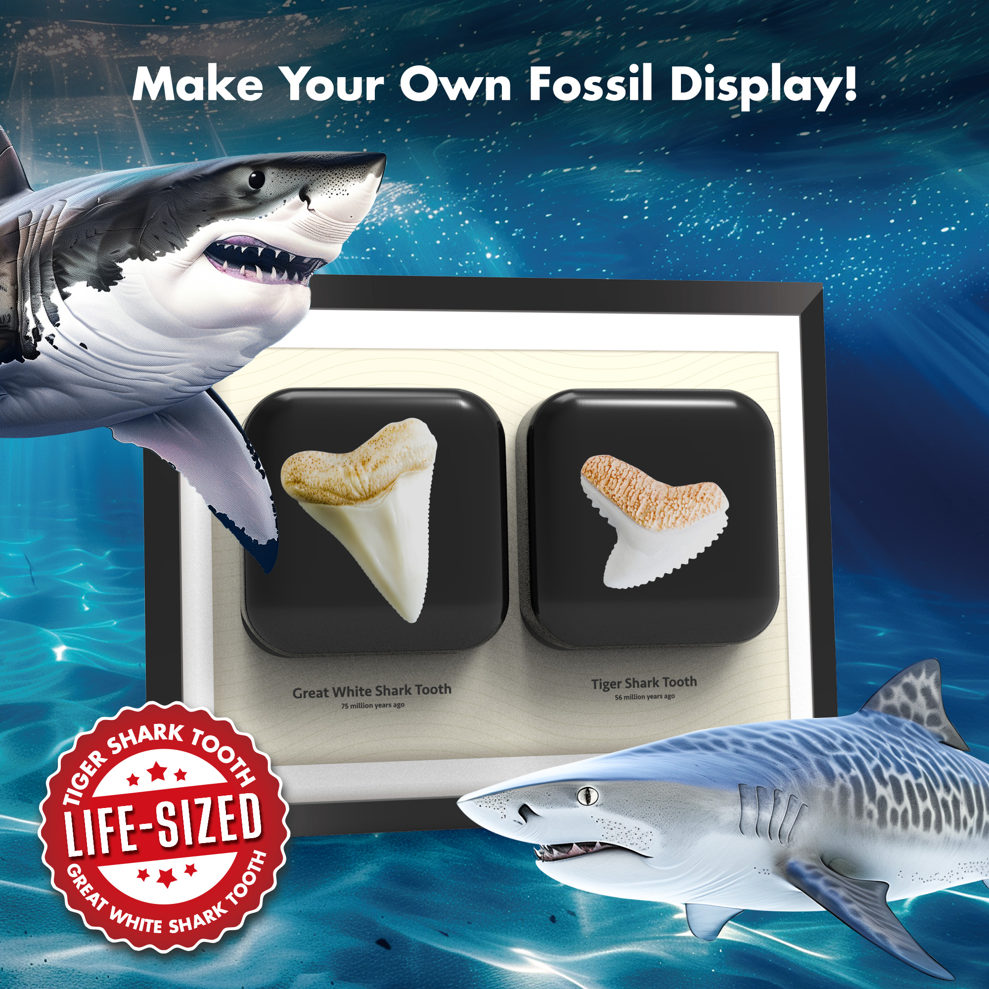- DIY Your Own Shark Fossil Display:Turn your finds into a showcase with the included fossil display kit! It comes with 1 display frame and 2 glue dots, so you can proudly display your Great White and Tiger Shark Tooth fossils as desk decor. Preserve your shark treasures in style.