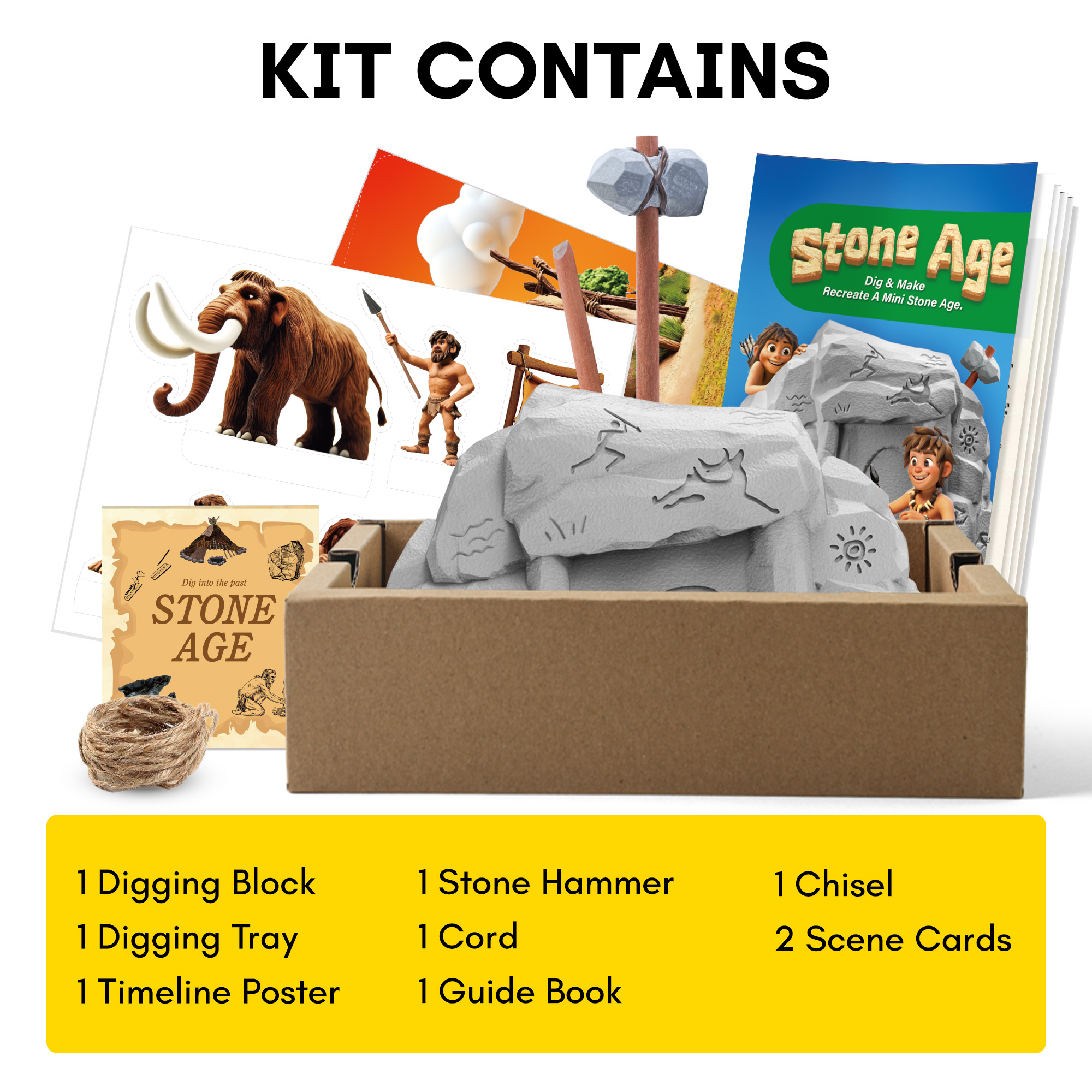 - [Complete Archaeological Digging Adventure Kit] Includes all the tools kids need for an exciting excavation: 1 digging block, 1 stone hammer, 1 chisel, 1 digging tray, 1 cord, 2 scene cards, 1 timeline poster, and 1 guidebook. Every tool is specially designed for small hands, making it safe and easy for young explorers to uncover ancient treasures!