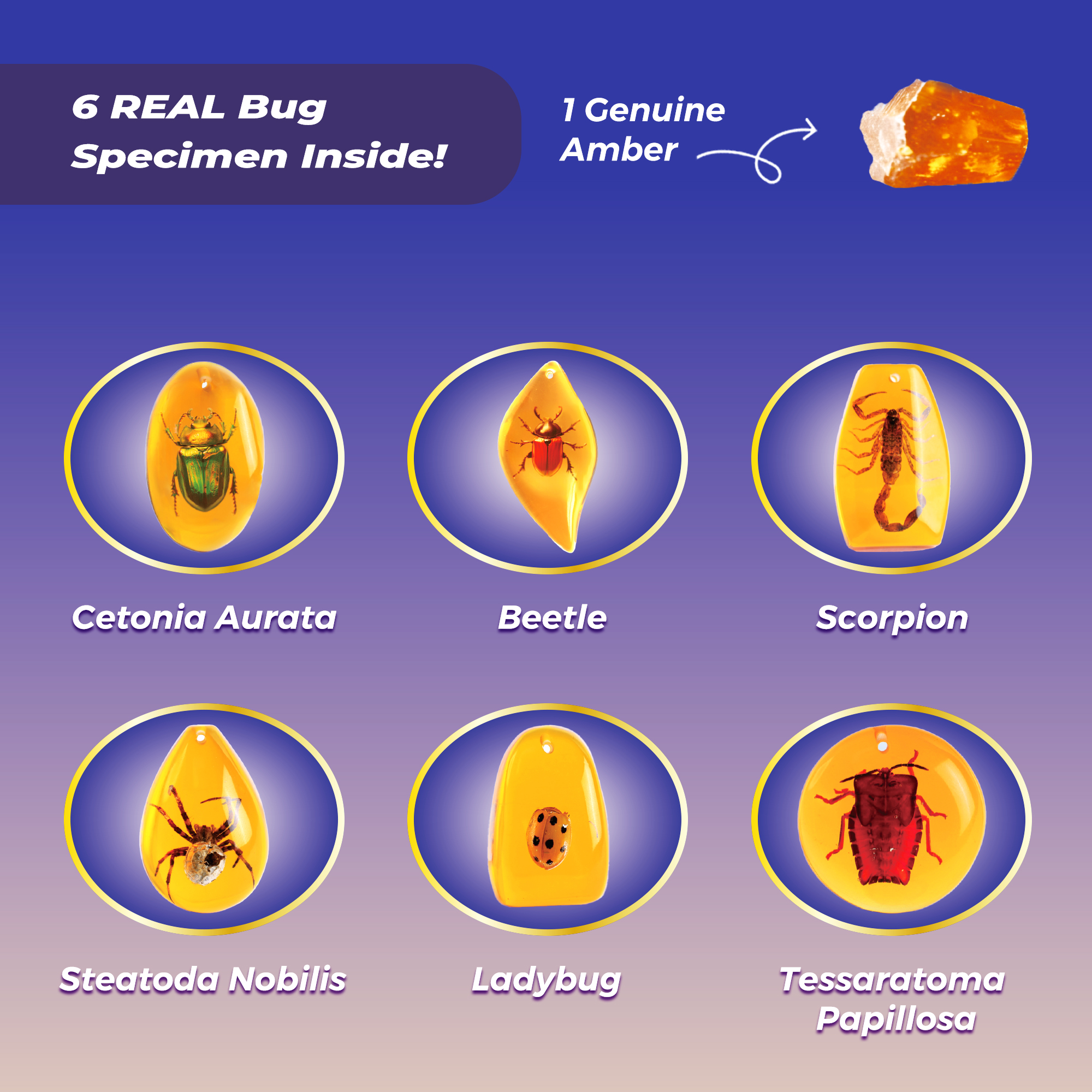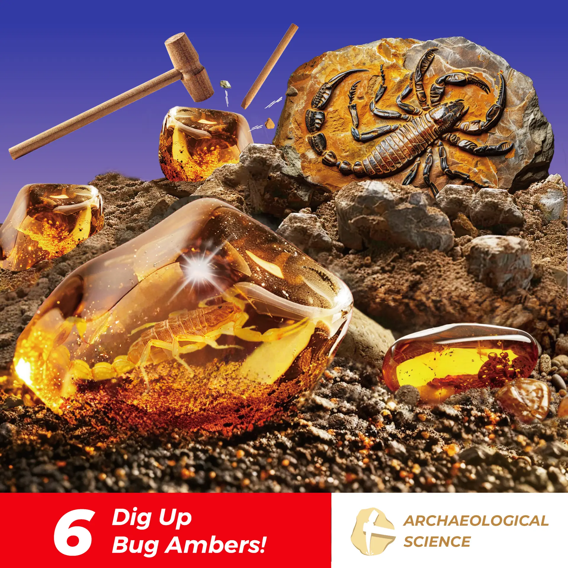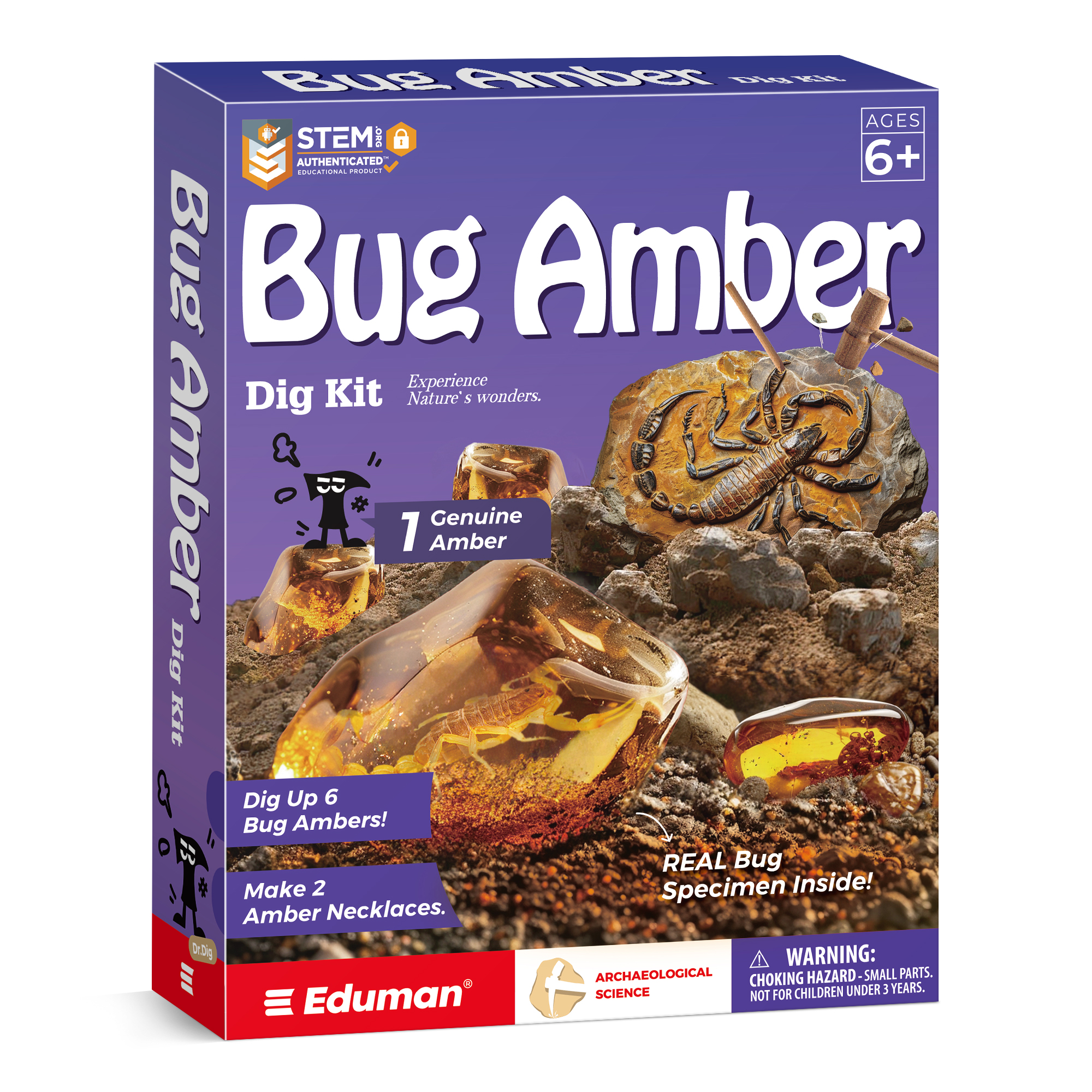- [Abundant Kit Contents]🧰The EDUMAN Amber Dig Kit contains 1 digging block with 6 artificial insect ambers and 1 natural amber. Insects include Cetonia Aurata, Beetle, Scorpion, Steatoda Nobilis, Ladybug, and Tessaratoma Papillosa. Also included are 1 hammer, 1 chisel, and 1 brush for digging, 1 collection pouch for storage, 2 necklace cords for making jewelry, and 1 instruction manual, providing comprehensive content.