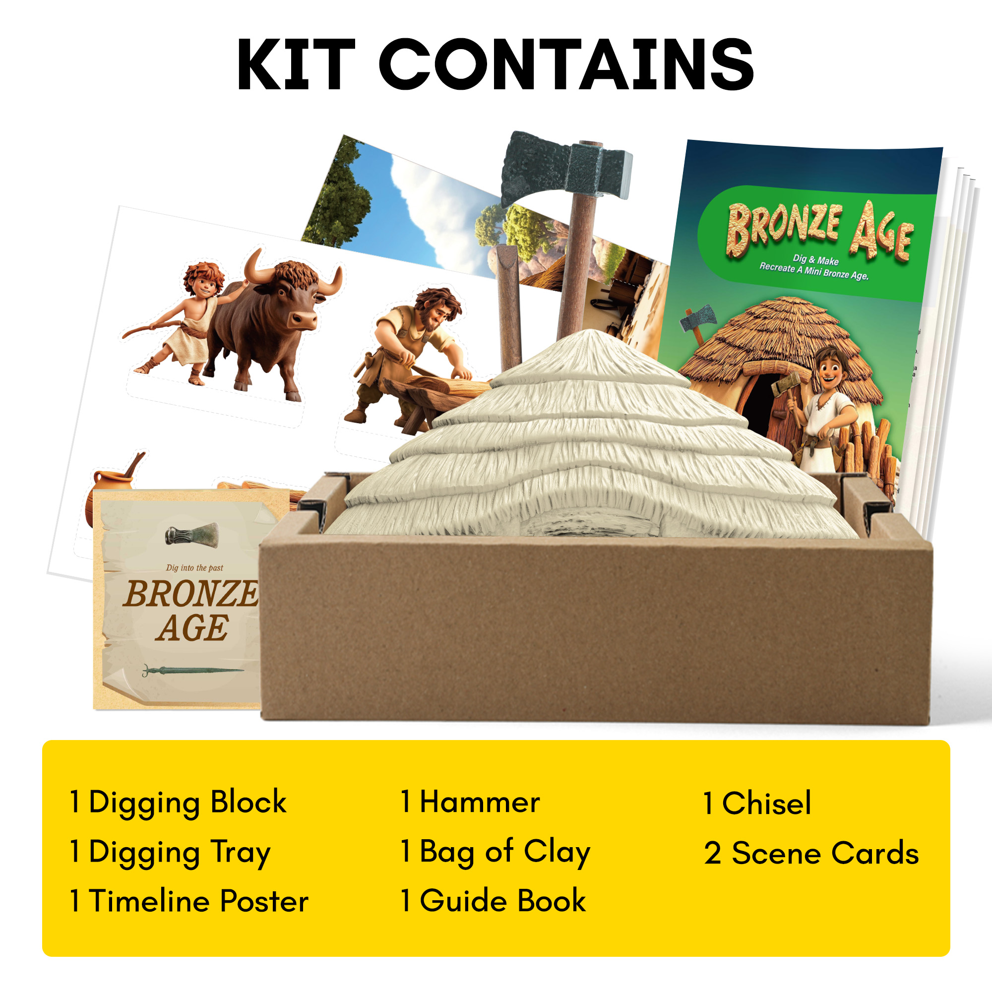 - [EXCAVATE BRONZE AGE ARTIFACTS] Become a young archaeologist with this bronze age dig kit! Dig up authentic replicas including Stonehenge pieces, ancient pottery, and malachite stones using real excavation tools like a chisel and hammer. Perfect for kids who love fossil digging kits and history adventures.