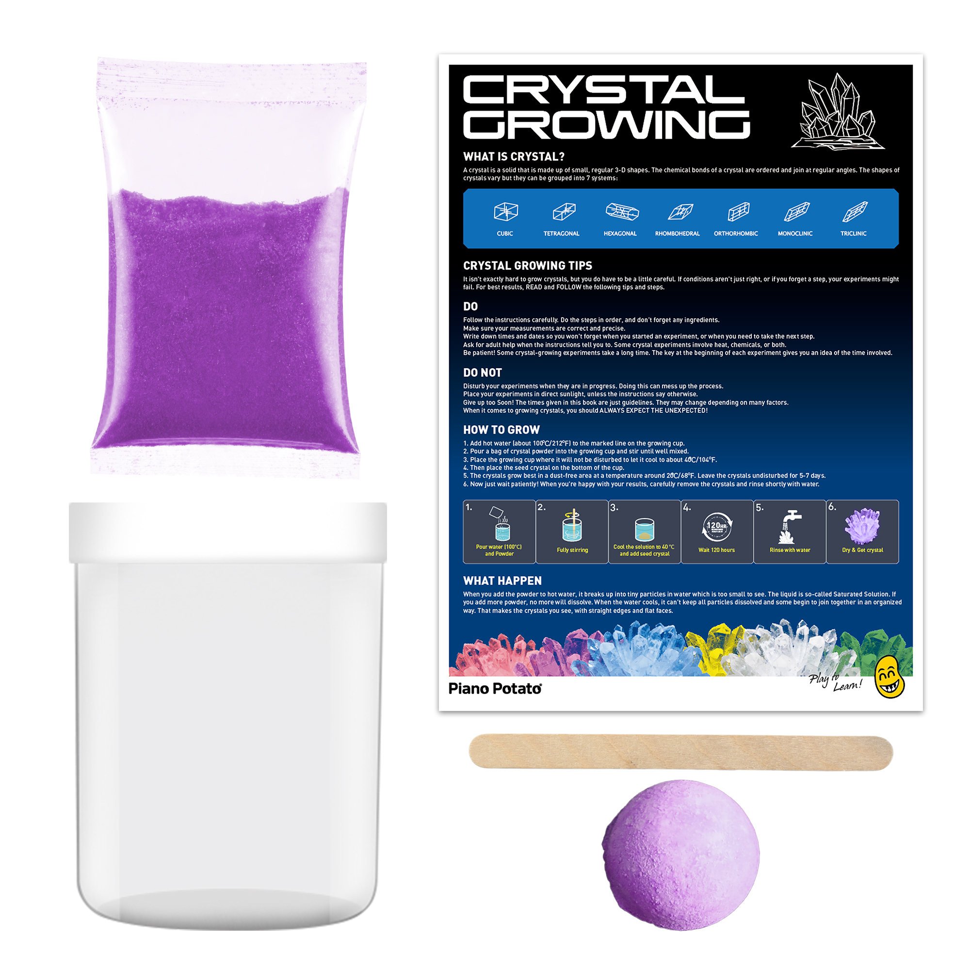 - 🧪 All-In-One STEM Science Kit: No Extra Supplies NeededIncludes everything for grow your own crystals success: crystal powder, seed crystal, plastic container, and stir stick. This complete crystal science kit lets kids mix, plant, and observe independently—perfect for science experiments for kids 6-8 and no extra materials required.
