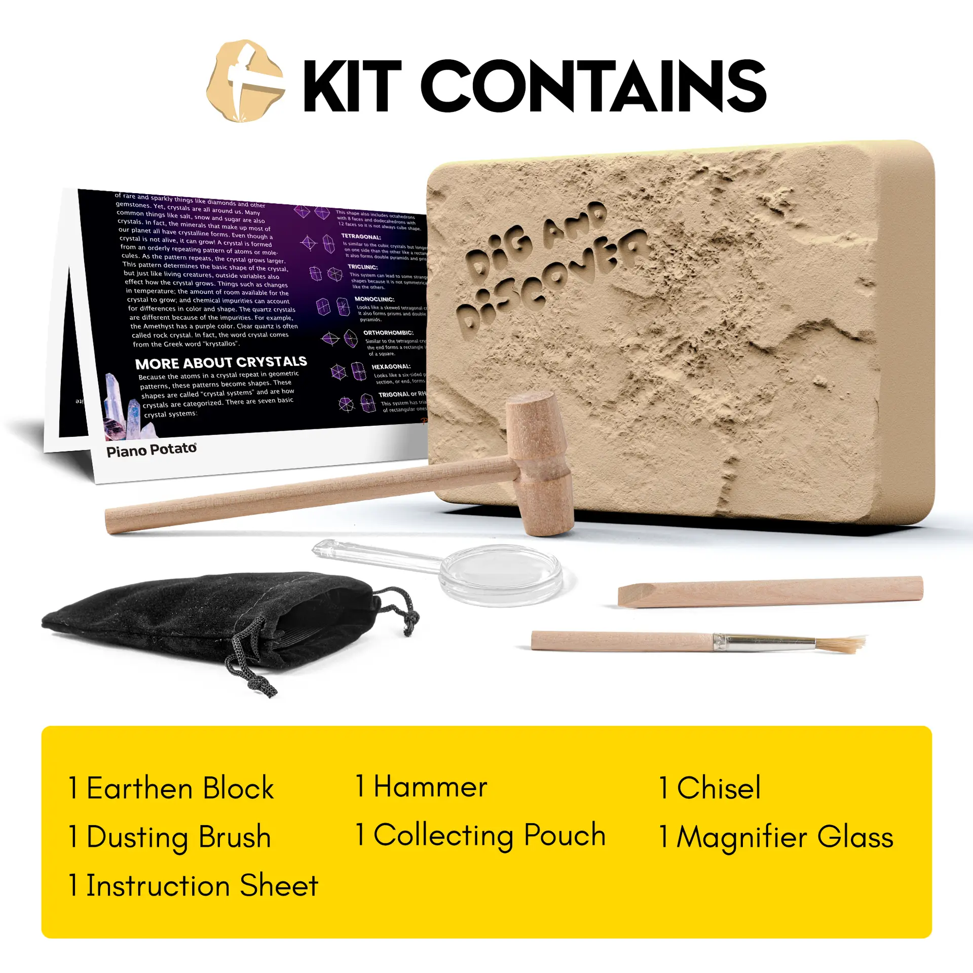 - [COMPLETE KIT FOR KIDS]: The kit includes all necessary tools for digging, plus a handbook with detailed information on the gems, crystals, and minerals your child will discover. It also comes with a storage bag for kids to keep their gemstone collection safe and organized. A must-have for budding geologists!