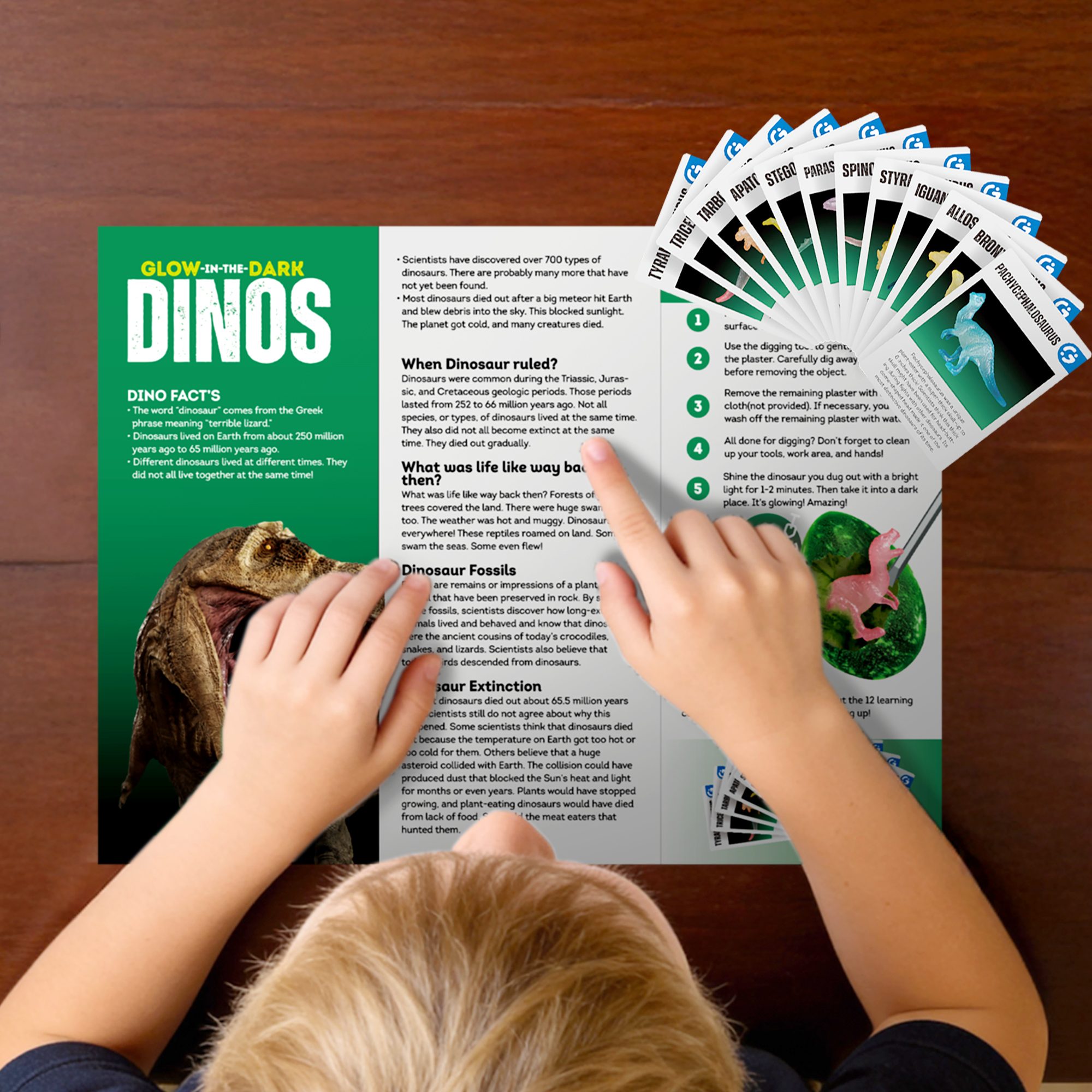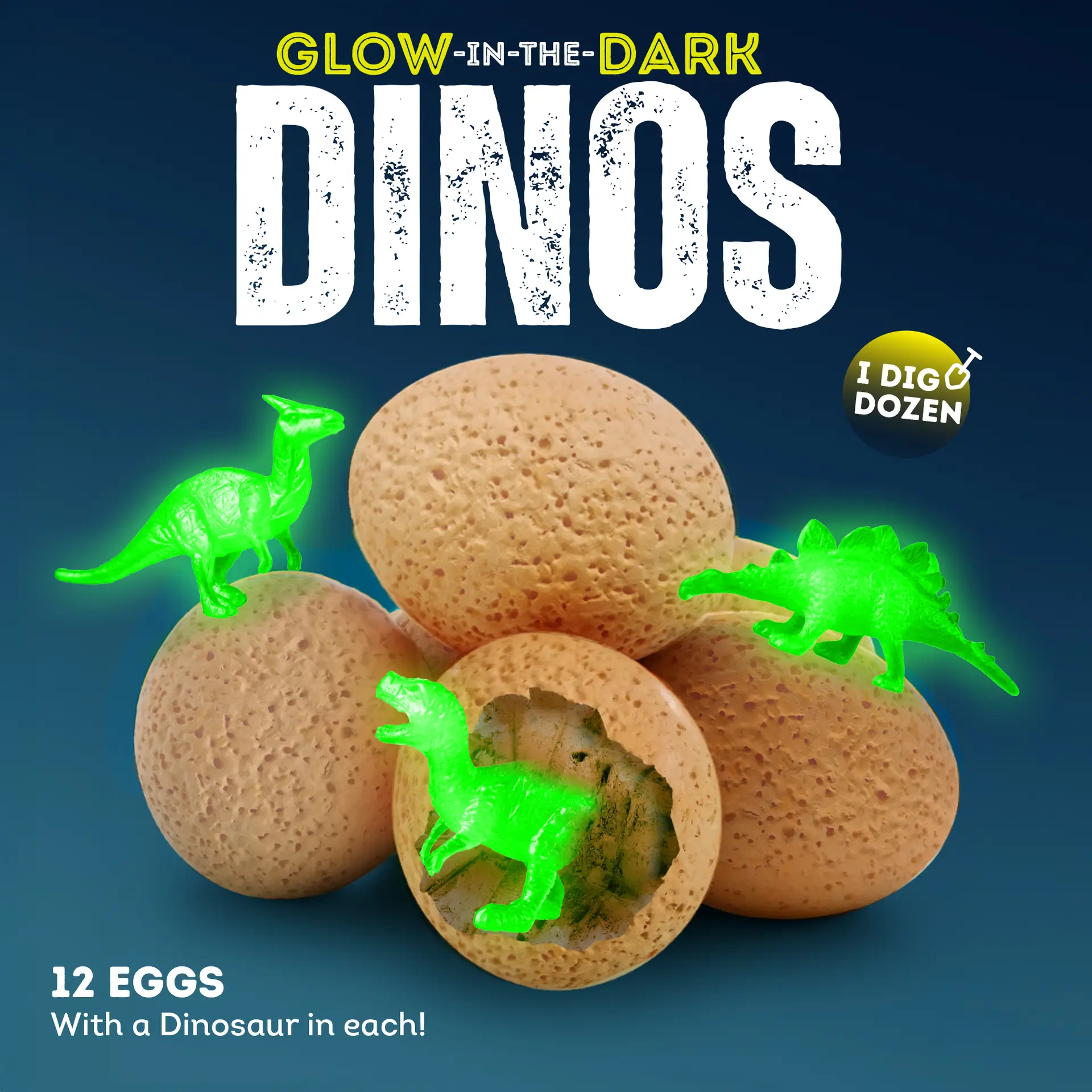 - [Dig up 12 noctilucent dinosaurs] This dinosaur dig kit contains 12 dinosaur eggs, each hiding a unique glow-in-the-dark dinosaur. Kids can crack open the eggs and unearth the hidden dinosaurs, sparking interest in dinosaur toys.