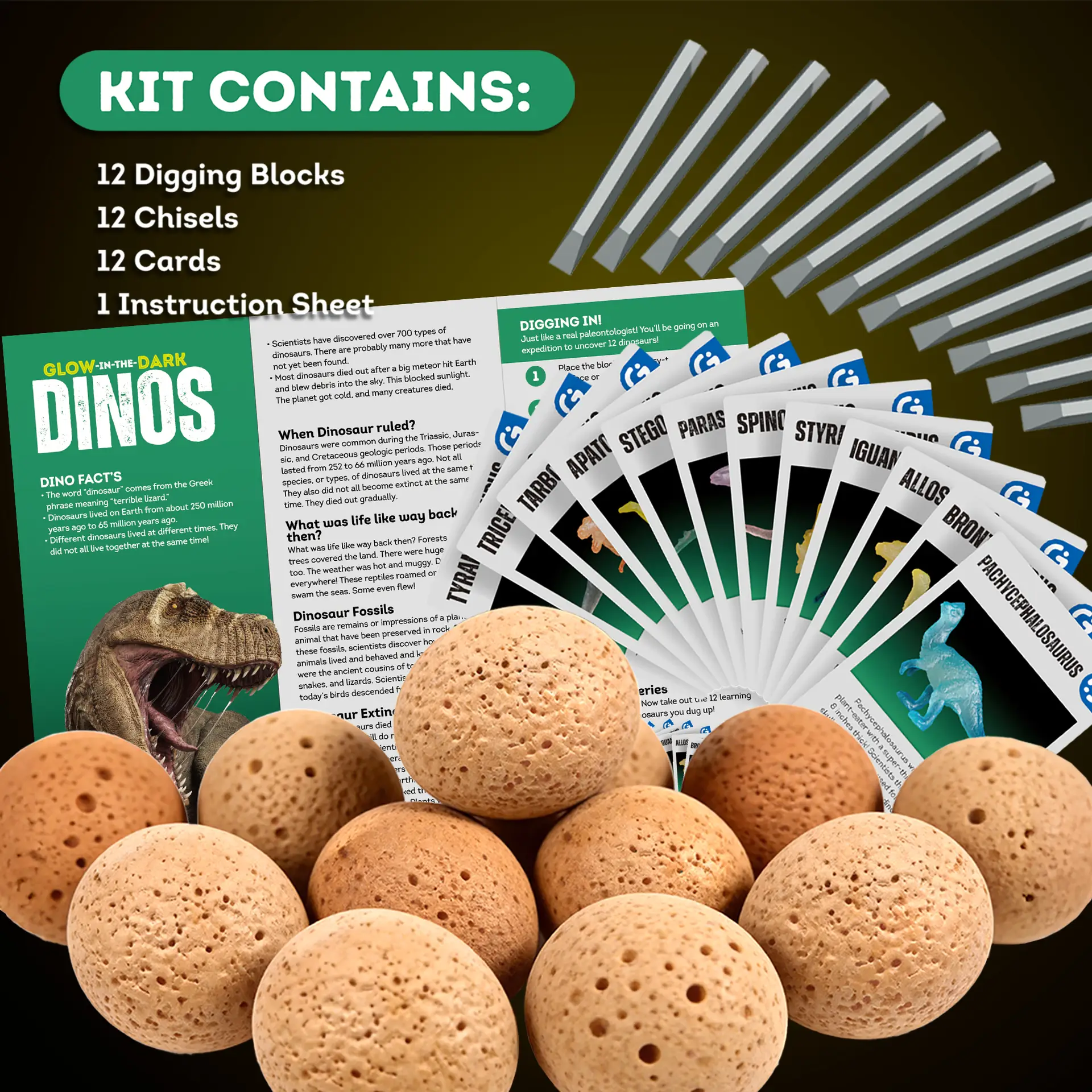 - [Complete dinosaur eggs excavation dig kit] The set contains 12 dino eggs, 12 chisels, 12 learning cards about dinosaurs and detailed instructions. This dinosaur egg toys offers everything children need to immerse themselves in the world of dinosaurs.