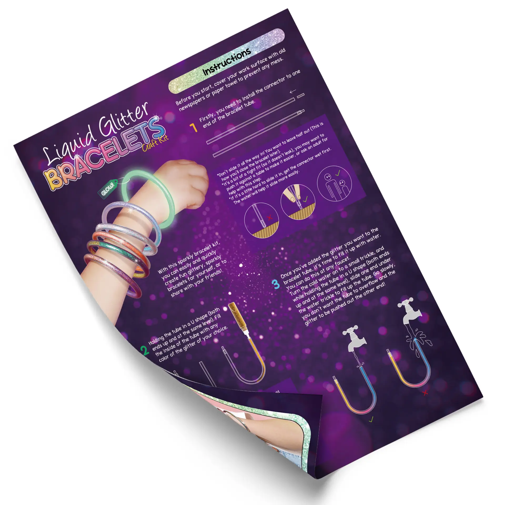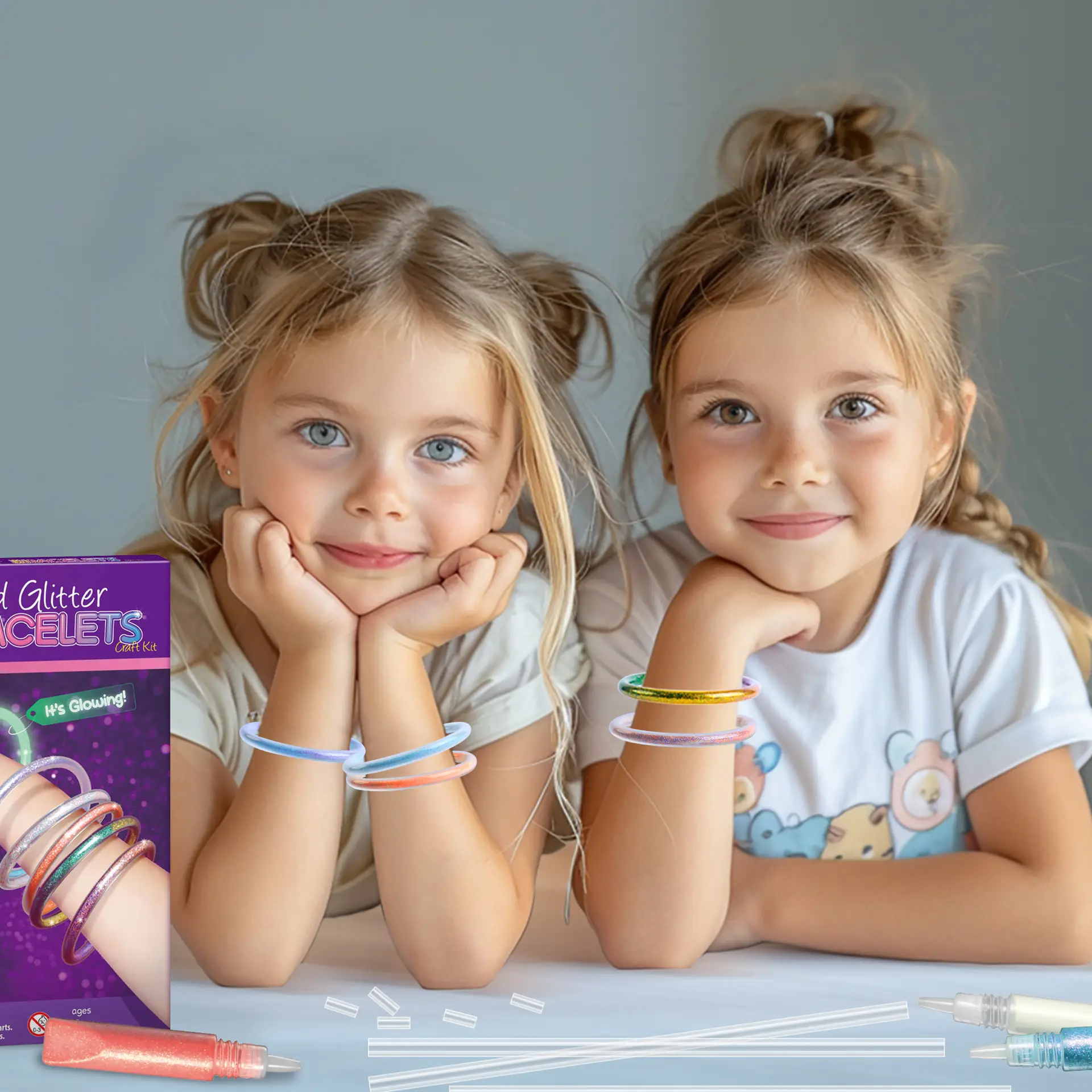 - All-in-One Bracelet Maker Set – Includes 12 bracelet tubes, 12 connectors, 6 glitter colors (with glow glitter), plus an easy instruction guide.