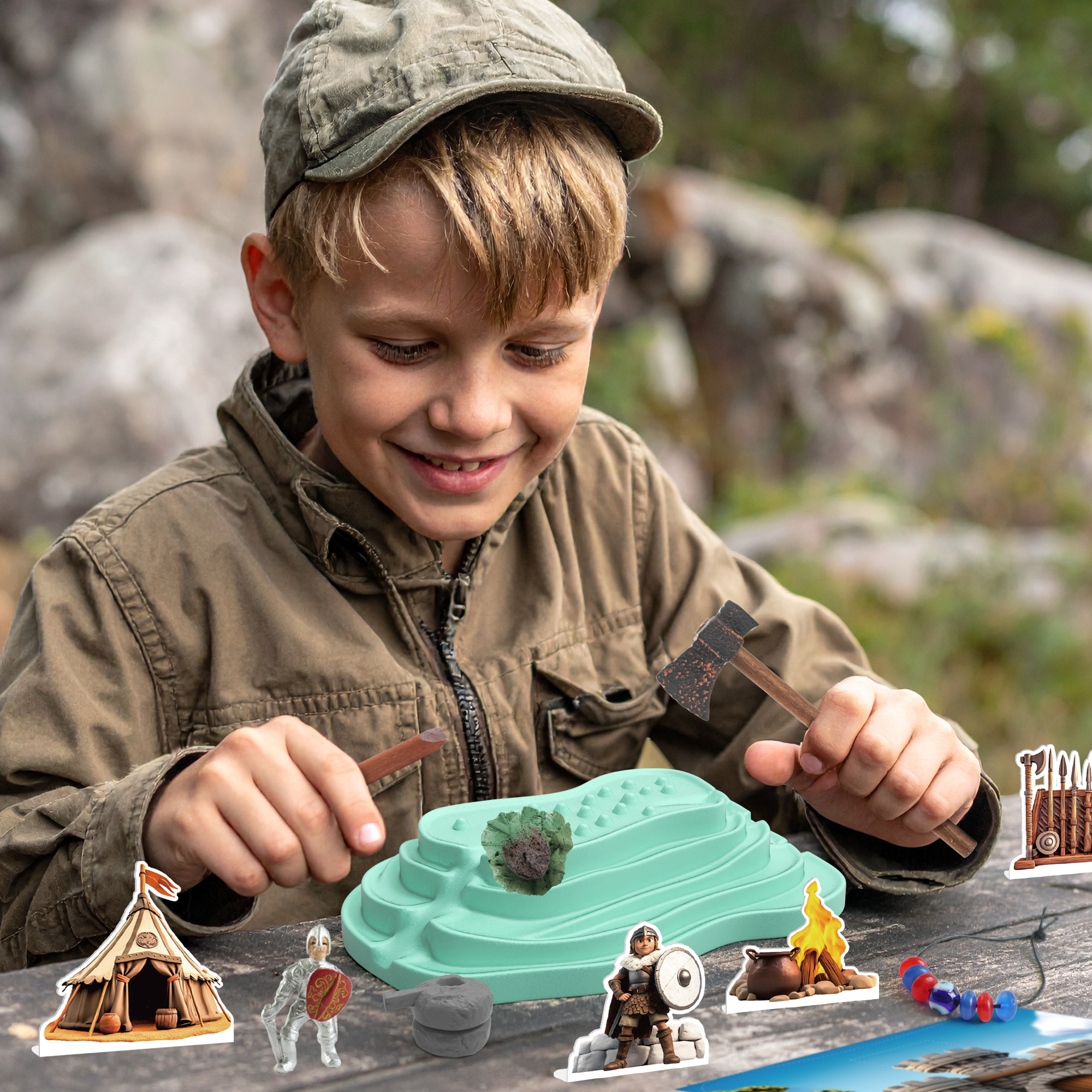 - [Uncover Iron Age Artifacts] Become a young archaeologist with this Iron Age dig kit! Dig up authentic replicas including a rotating quern stone, ancient helmet, animal-patterned beads, and rocks—just like real historical finds. Perfect for kids who love fossil digging kits and hands-on history adventures.