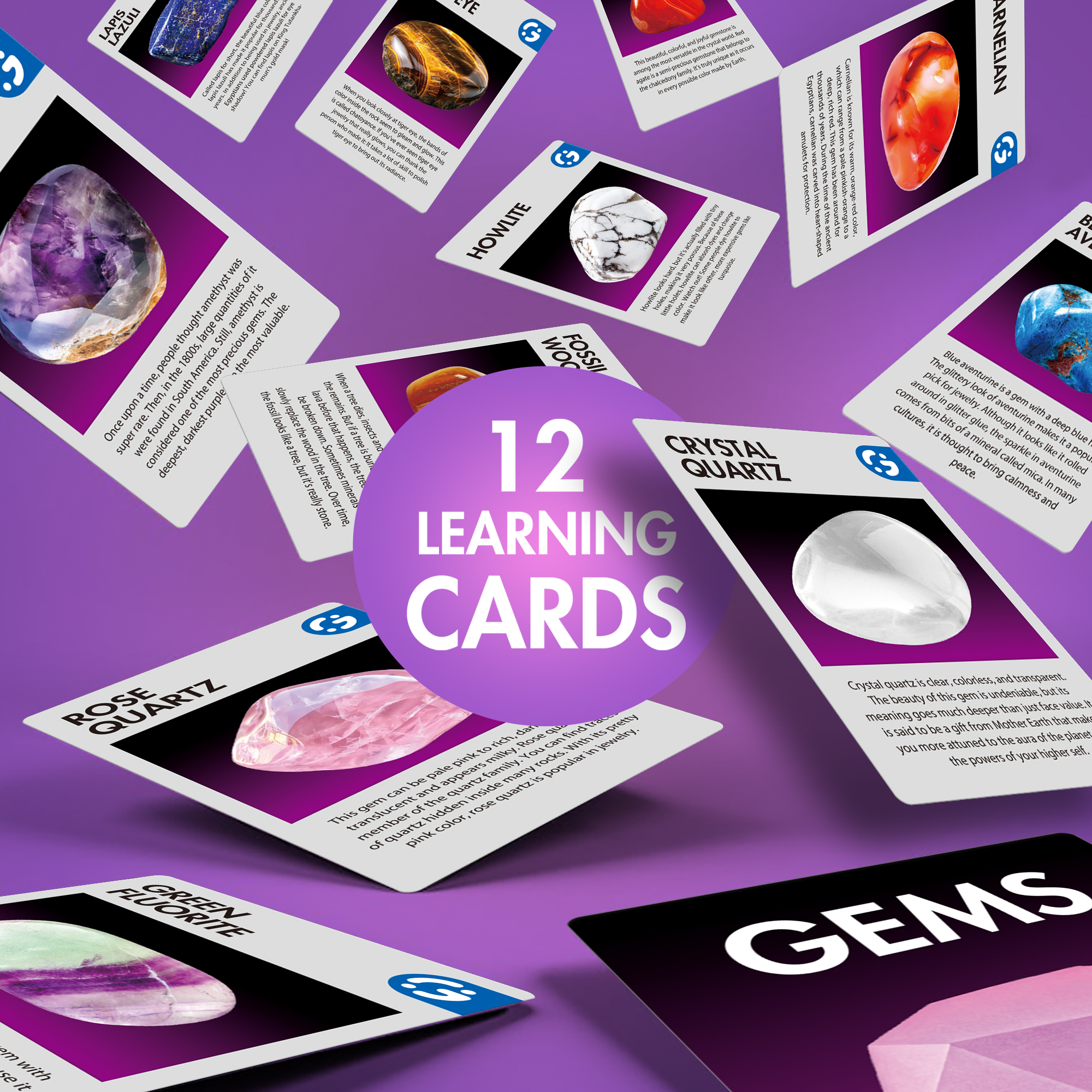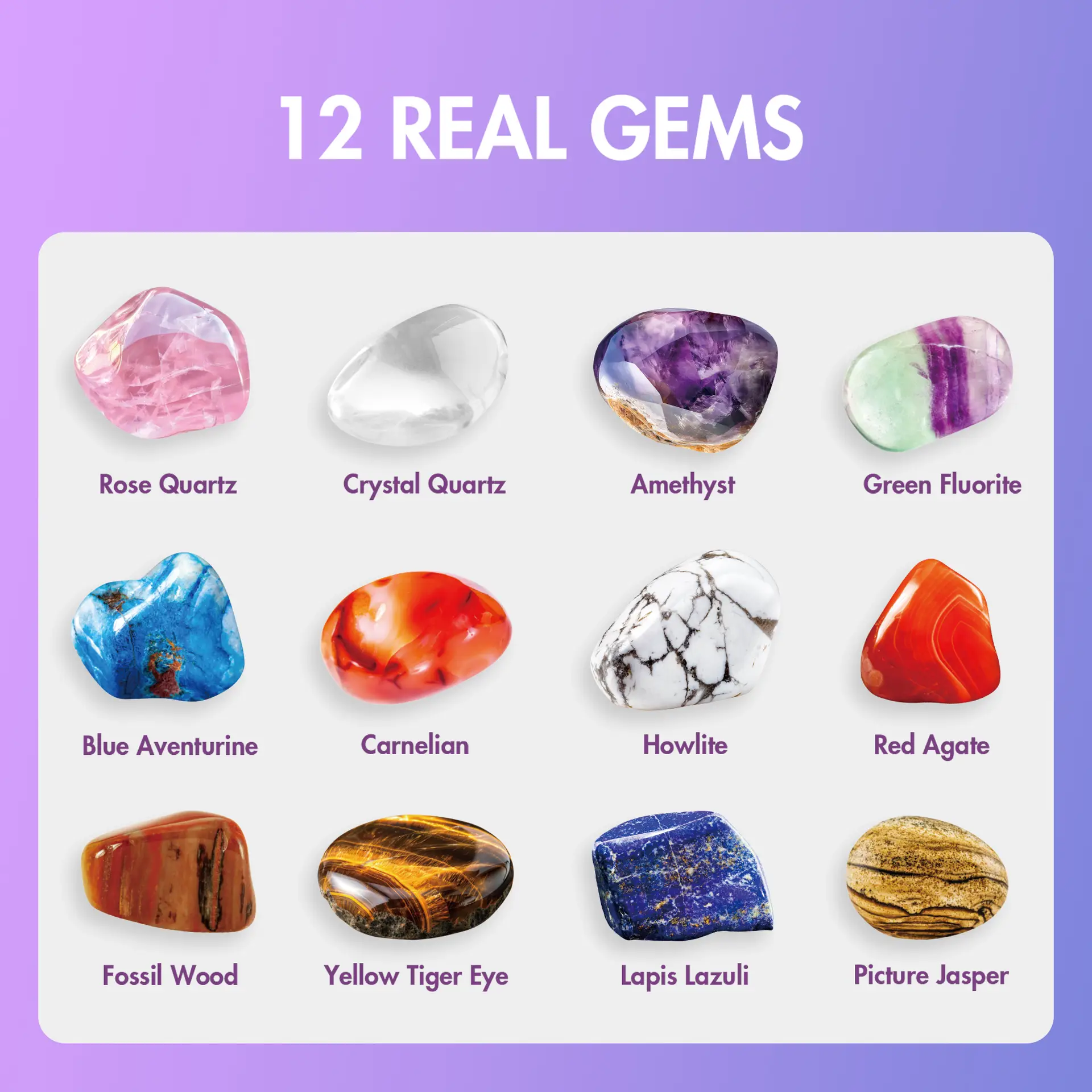 - Dig 12 Gemstones: Get ready to dig out 12 precious gems hidden on the gemstone blocks like a real geologist! Including rose quartz, blue aventurine, green fluorite, red agate, yellow tiger’s eye and much more. Learn more about the gems for children included in the coloured educational toy for children.