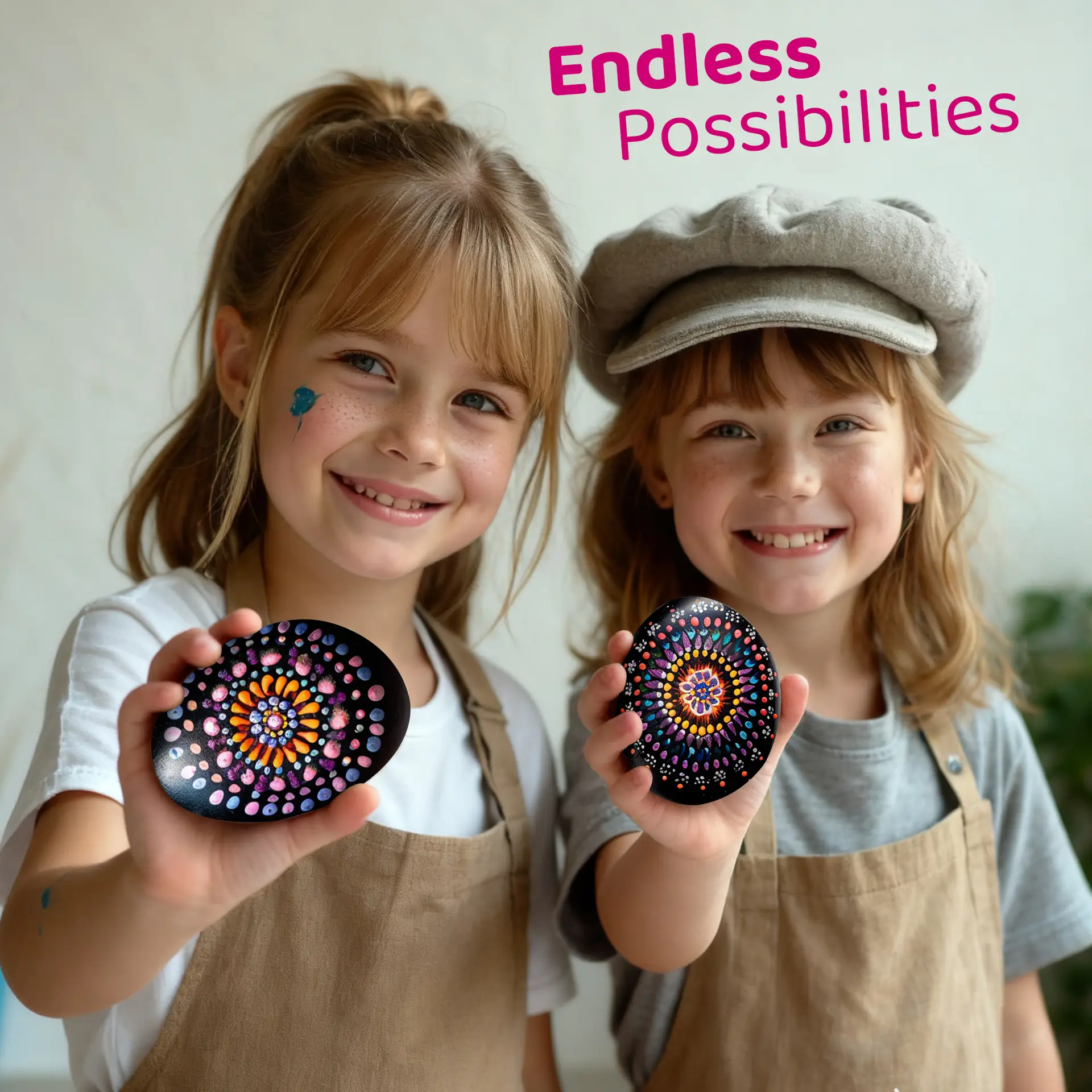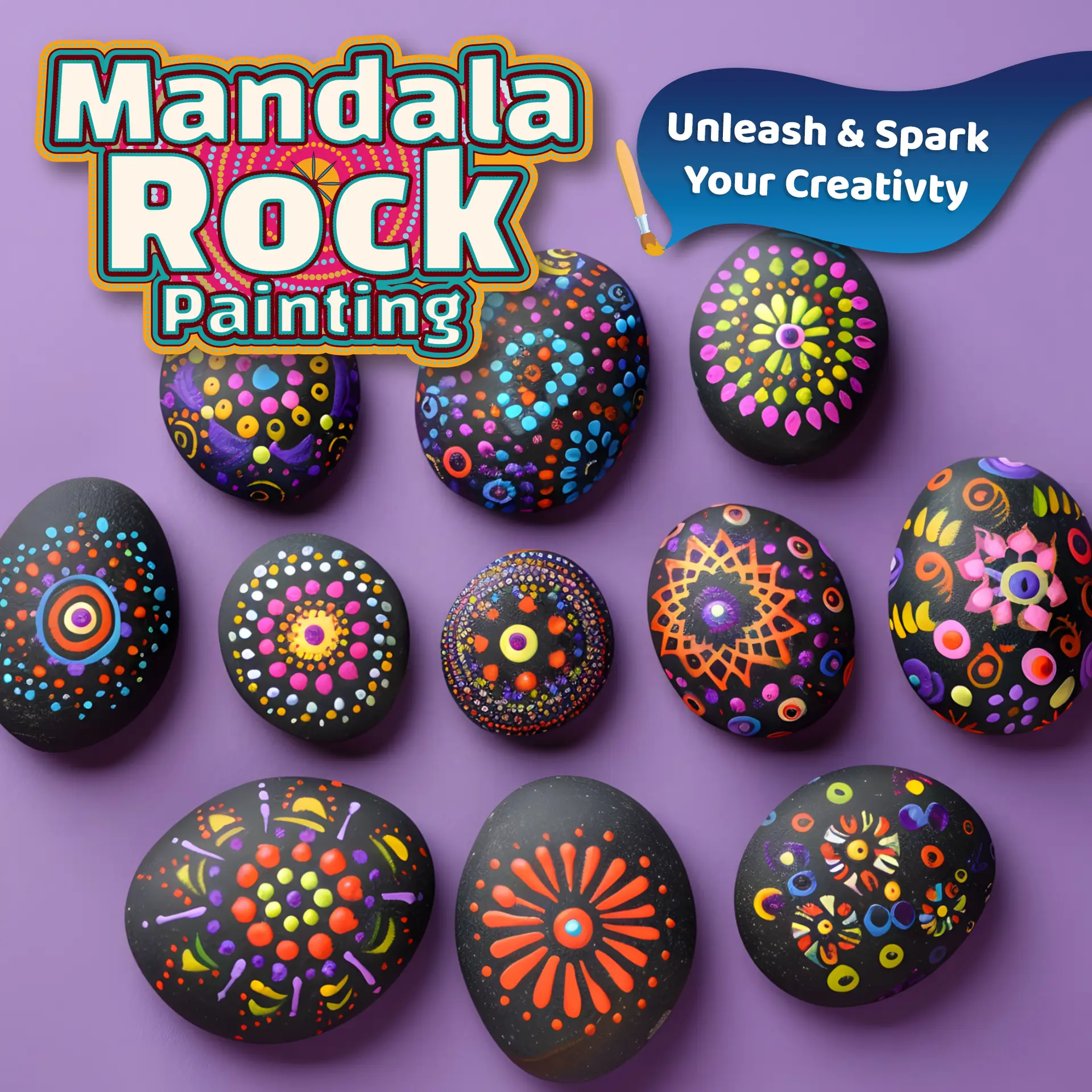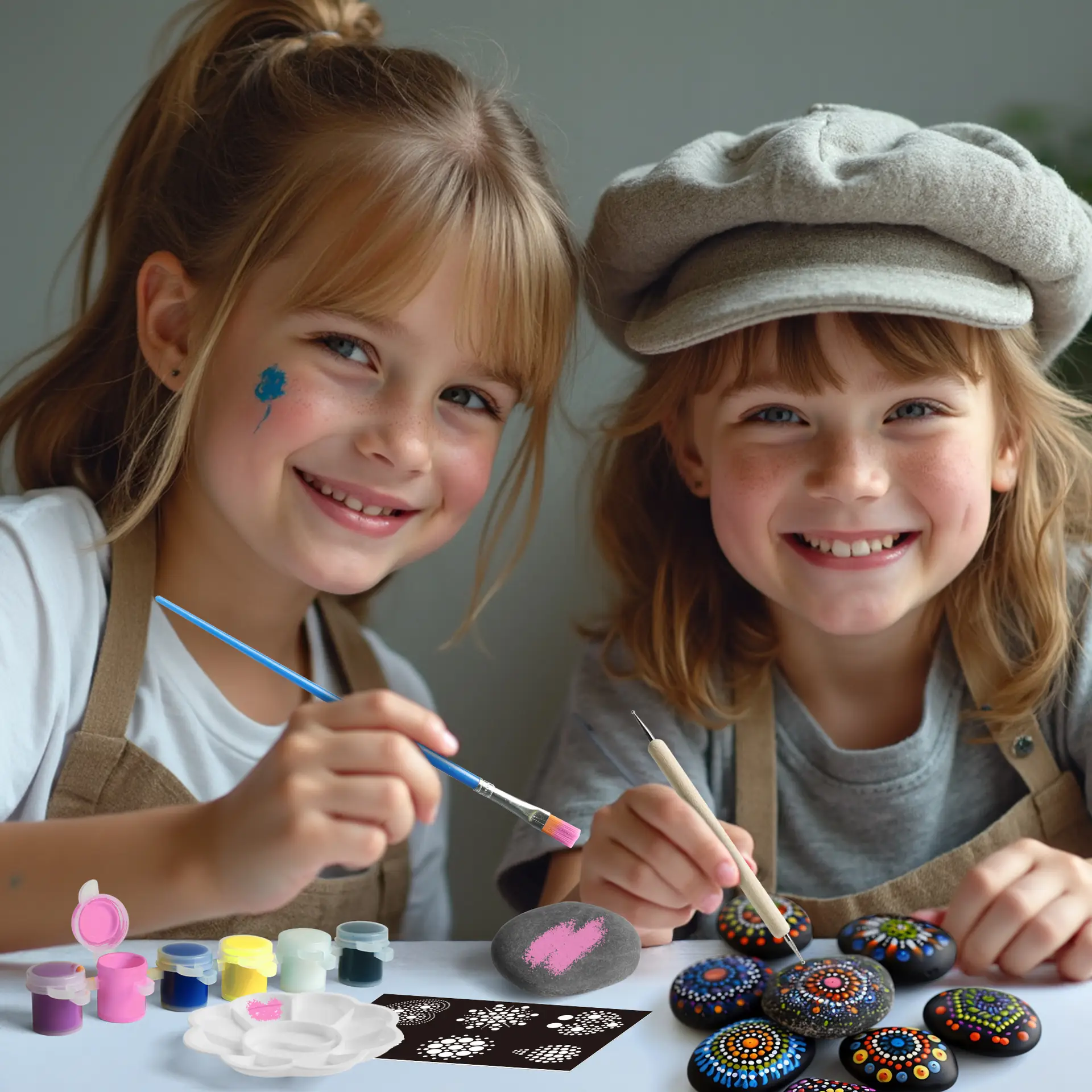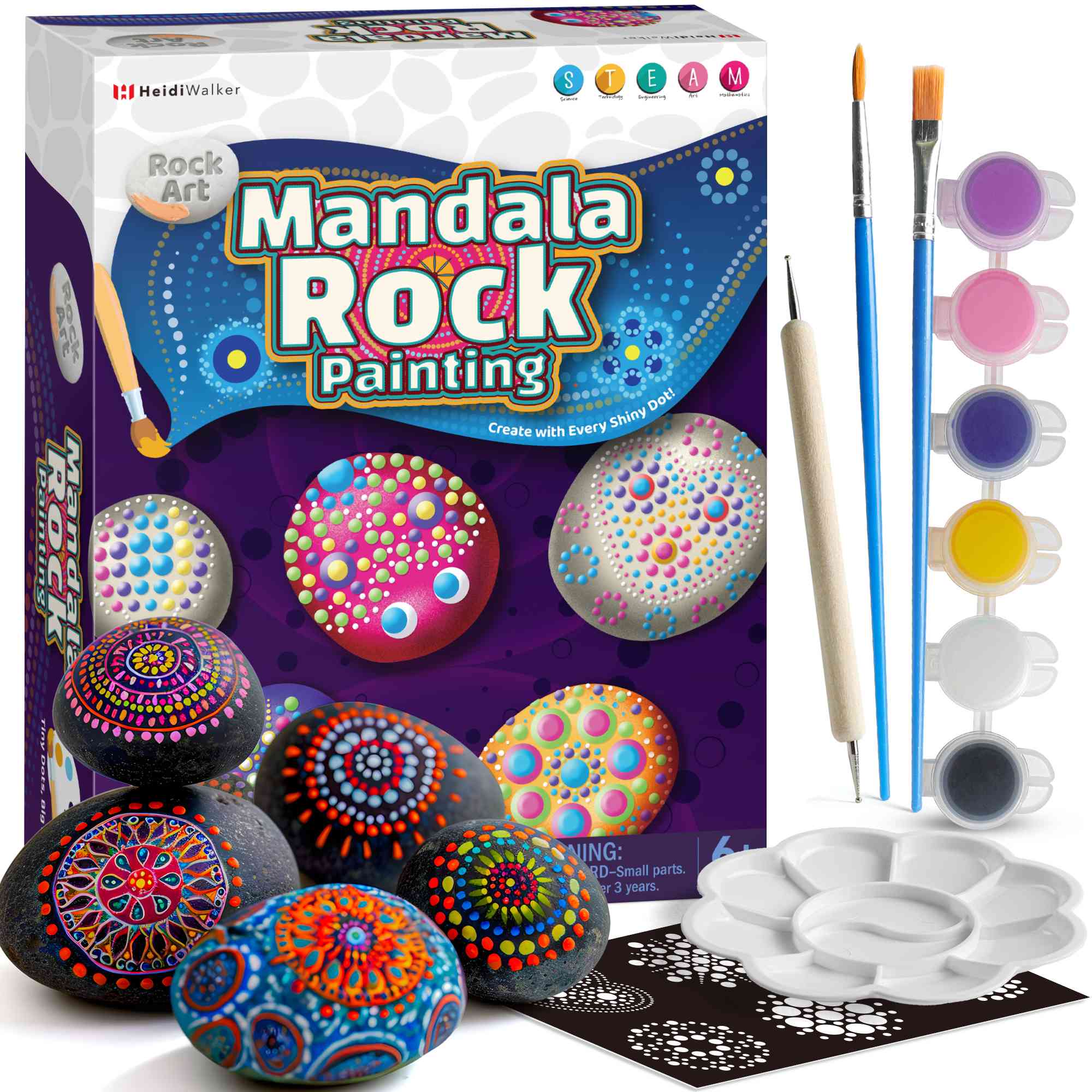 - Complete Kit, Nothing Else Needed – 10 rocks, 6 paints, 2 brushes, 5 dotting tools, 6 stencils, and a palette.