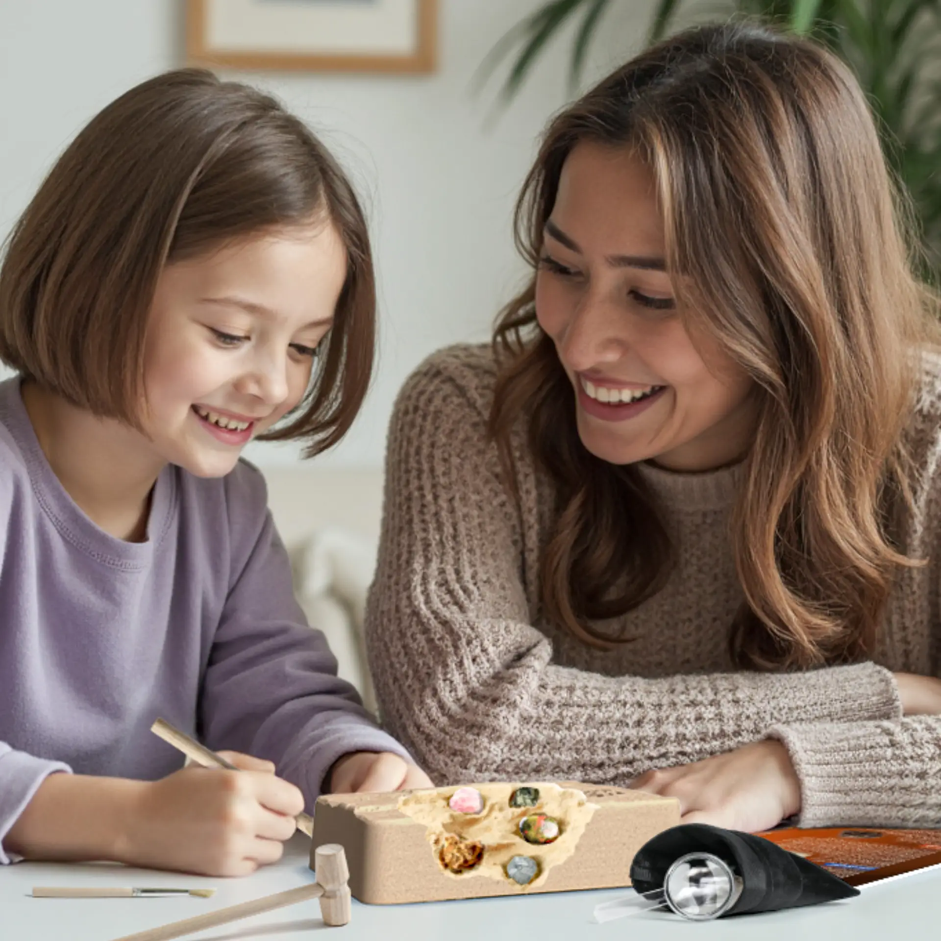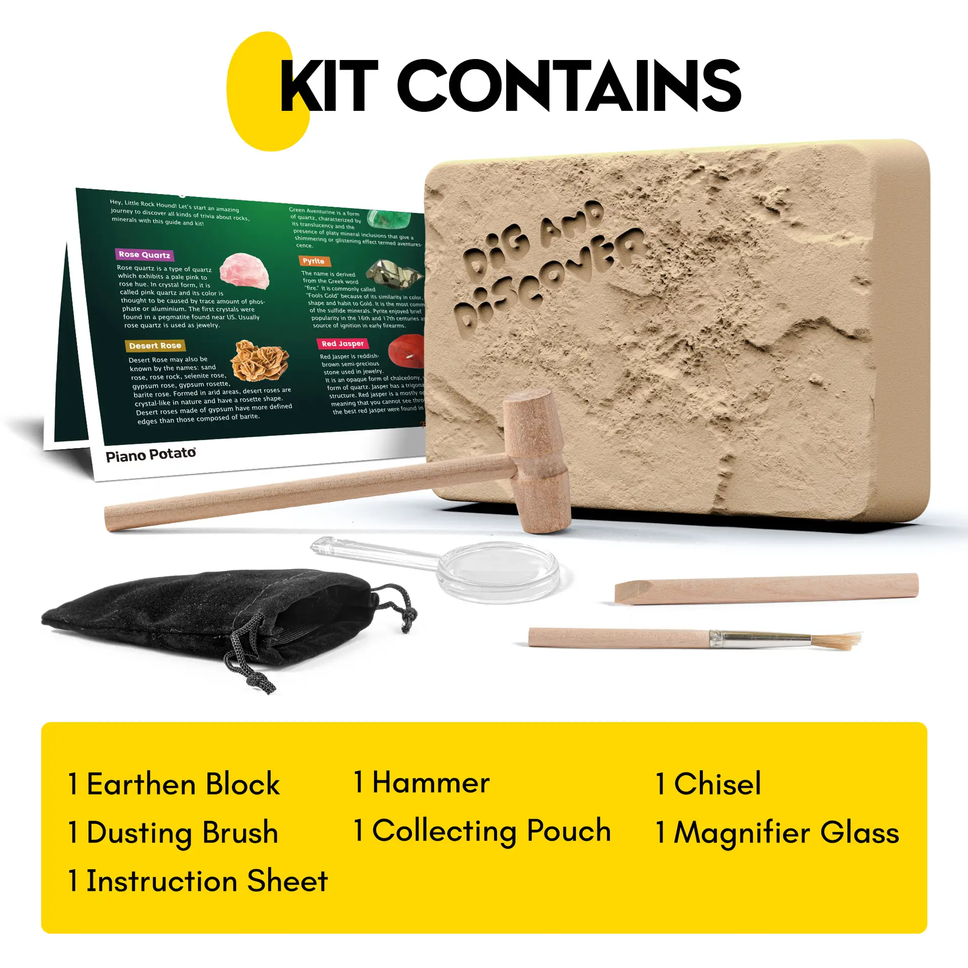 - All-in-One Kid-Friendly Mining Tools:No extra supplies needed! This rock mining kit for kids includes everything for successful excavation: 1 earthen block, 1 dusting brush, 1 hammer, 1 chisel, 1 magnifier glass, 1 collecting pouch and 1 instruction sheet. The kid-sized tools and soft earthen block make digging safe and easy for little hands.