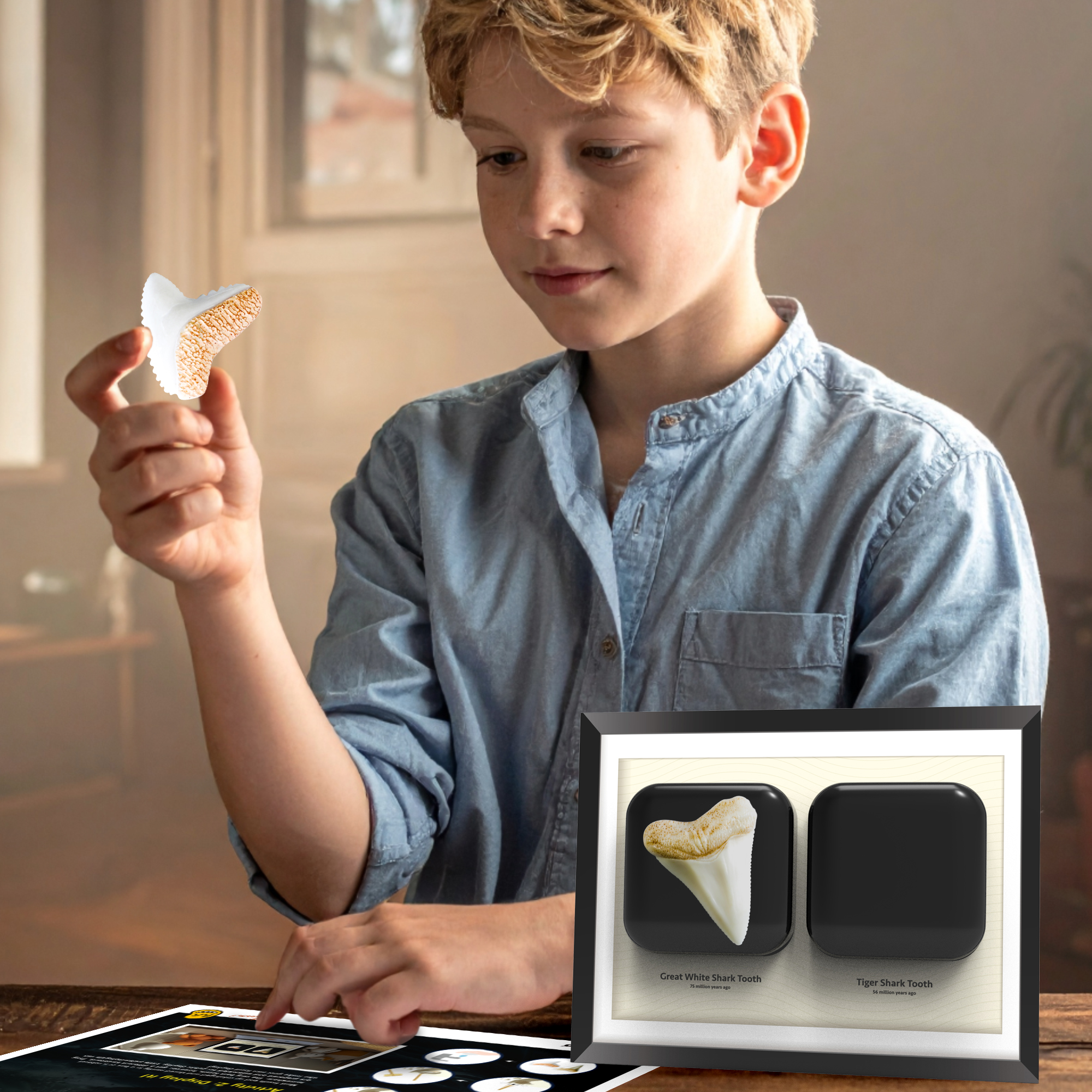 - DIY Your Own Shark Fossil Display:Turn your finds into a showcase with the included fossil display kit! It comes with 1 display frame and 2 glue dots, so you can proudly display your Great White and Tiger Shark Tooth fossils as desk decor. Preserve your shark treasures in style.
